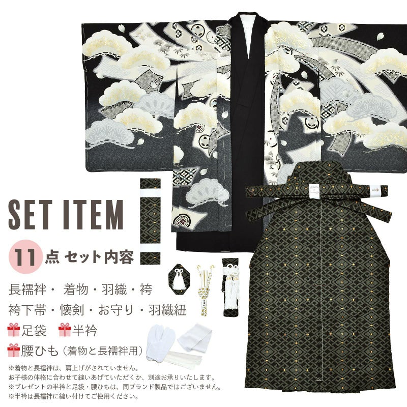 【商品内容】長襦袢・着物・羽織・袴・袴下帯・懐剣・お守り・羽織紐・足袋(プレゼント)・半衿(プレゼント)・腰ひも2本(プレゼント)の計11点