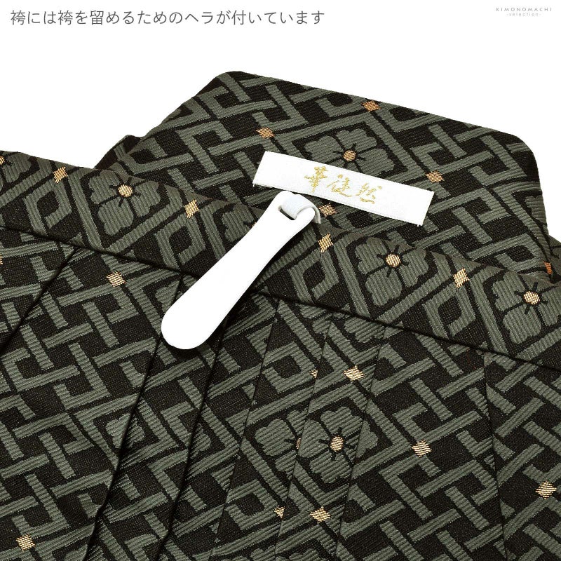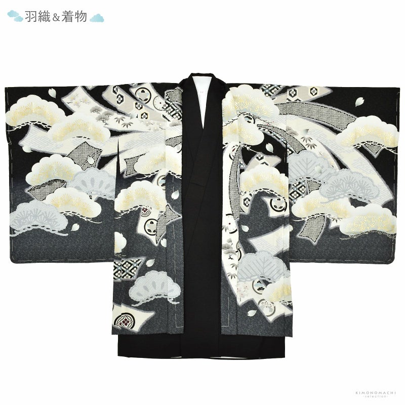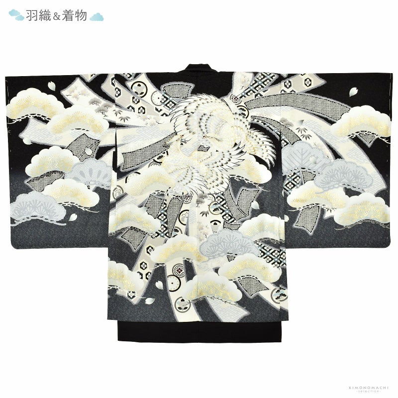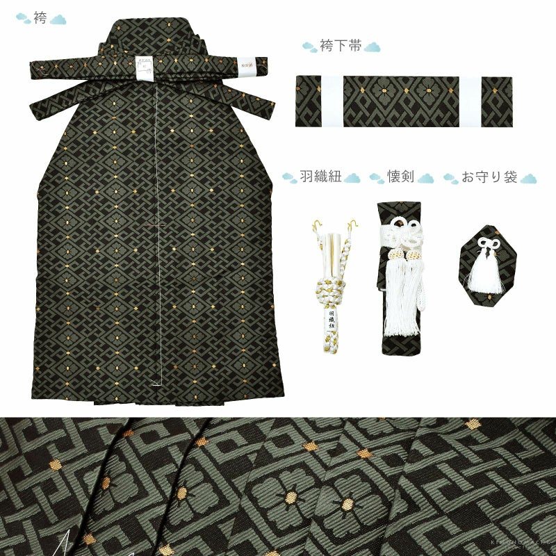 羽織は紗綾形の地模様のある黒の地にグレーの裾ぼかし。背には白、黒、臙脂、深緑の配色の吉祥文が詰まった、アイボリー、淡いグレーの束ね熨斗。その上に勇ましく向かい合った2羽の白鷹、淡いグレーの松紋。マットな金彩が品格と豪華さを添えます。着物は黒色。白の襦袢がついています。袴は黒地に濃いグレー、ポイントにゴールドの入った花菱に宝結び文様。共布の帯。白とゴールドの羽織紐。