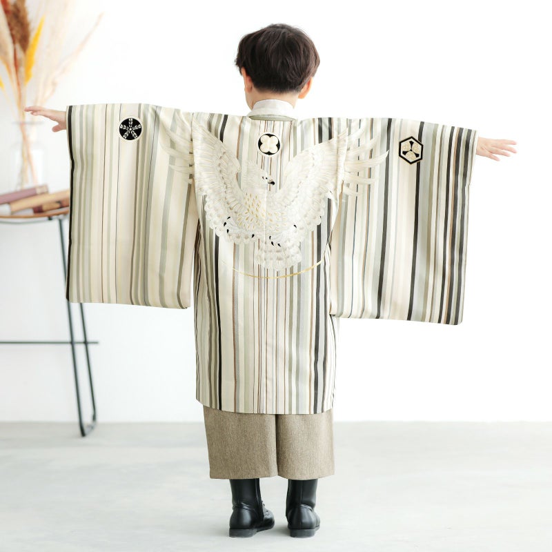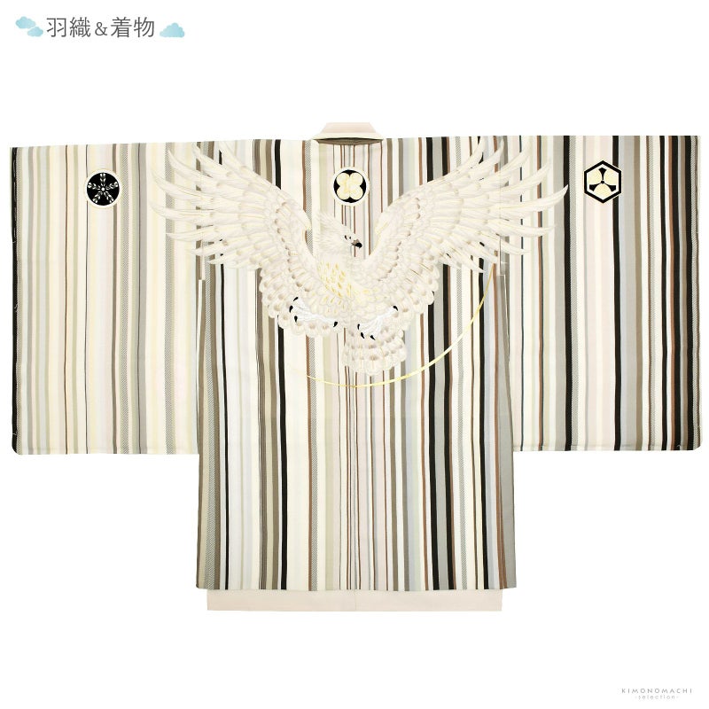 羽織は白やグレー、カーキ、ベージュ、濃い深緑色などのマルチストライプの上に、大きく翼を広げた白鷹。淡いグレージュ色、マットな金彩が奥行と煌びやかさを添えます。