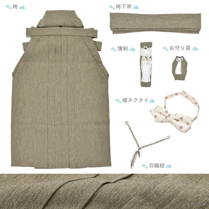 【商品内容】長襦袢・着物・羽織・袴・袴下帯・懐剣・お守り・羽織紐・蝶ネクタイ・腰ひも2本(プレゼント)・半衿(プレゼント)の計11点