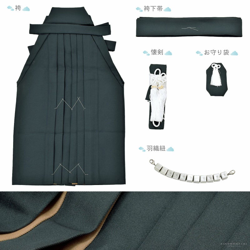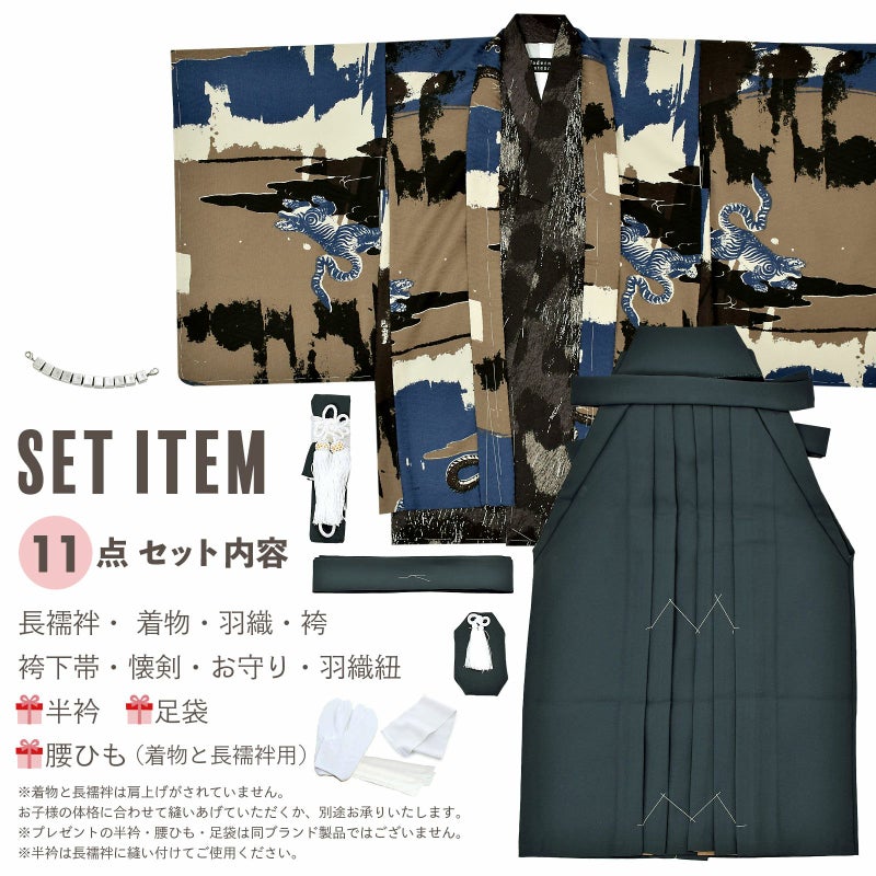 【商品内容】長襦袢・着物・羽織・袴・袴下帯・懐剣・お守り・羽織紐・半衿(プレゼント)・足袋(プレゼント)・腰ひも2本(プレゼント)の計11点