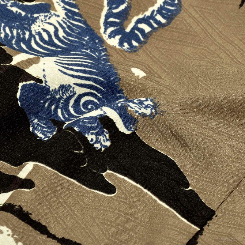 羽織は紗綾形の地模様に、グレイッシュな青藍、薄茶、その上にオフホワイトと黒のペイント調のかすれたような配色。陽の象徴である龍と、陰の象徴である虎が雲と共に表現されています。混沌とした世界の中で力強さと調和を願ったデザインです。着物は紗綾形にチャコールグレー、黒、薄茶の大きなヒョウ柄に、細かな線の銀箔を重ね合わせて毛並みを表現したデザイン。白の襦袢がついています。袴はとても暗い青緑色にヒダの内側が白茶色のアコーディオン袴。共布の帯、懐剣、お守り袋。キューブのメタルパーツの羽織紐。