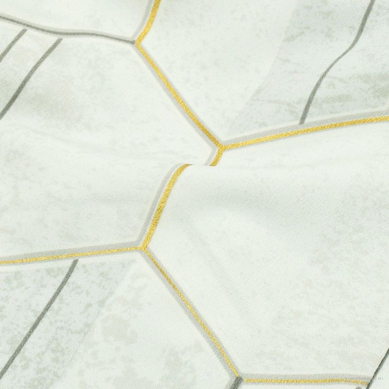 羽織は浅い白緑色に、抹茶色、金彩の入った亀甲文様。着物はグレー。白の襦袢がついています。袴はやや青みの濃いグレー。袴と共布の帯、懐剣。メタルパーツの羽織紐。白の付け襟にベージュのネクタイのセットです。
