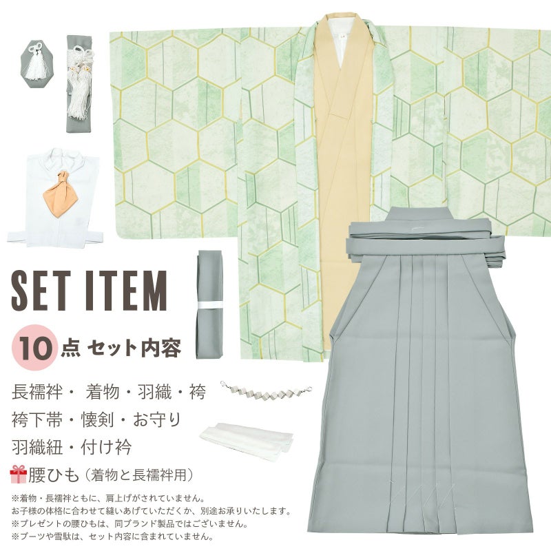 【商品内容】長襦袢・着物・羽織・袴・袴下帯・懐剣・お守り・羽織紐・付け衿・腰ひも2本(プレゼント)の計10点
