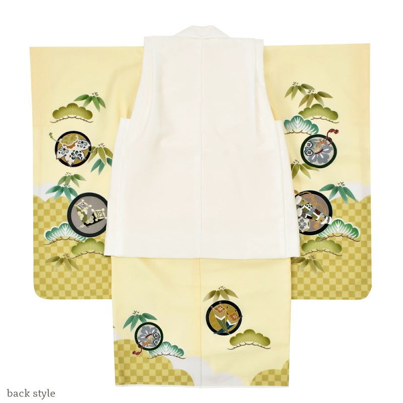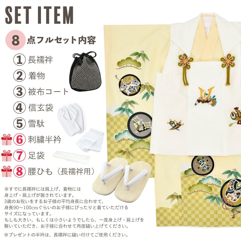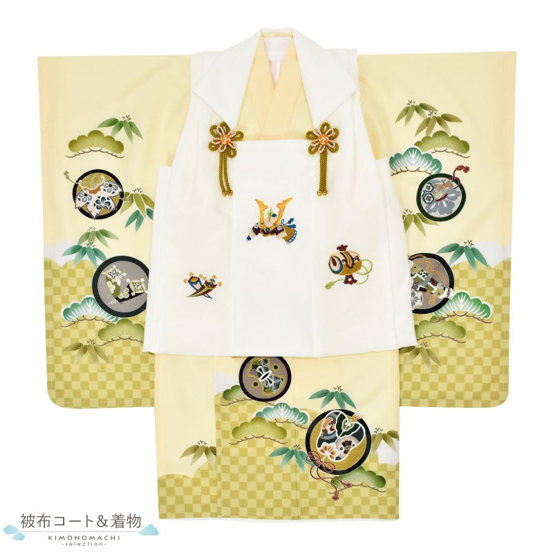 被布コートはやわらかい白地。刺繍で表現された紫、紺などの兜や宝尽くし紋。鶸色、ベージュの組紐の被布飾り。着物はクリームイエローの地、袖、裾に淡い抹茶色の市松文様の雲。緑や浅い黄緑色の松に笹。チャコールの軍配や巾着、巻物の宝尽くしの丸紋。白の長襦袢。黒地の疋田文様の巾着。