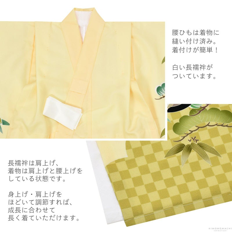 ※着物はすでに身上げ、肩上げが施されています。3歳のお祝いをするお子様の平均身長に合わせて、身長90~100cmぐらいのお子様がぴったりと着ていただけるサイズになっています。もしそれでは大きい、もしくは小さいようでしたら身上げ、肩上げを一度解いていただいて、お子様に合わせて、再度縫い上げてください。