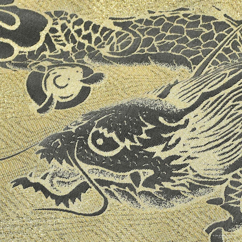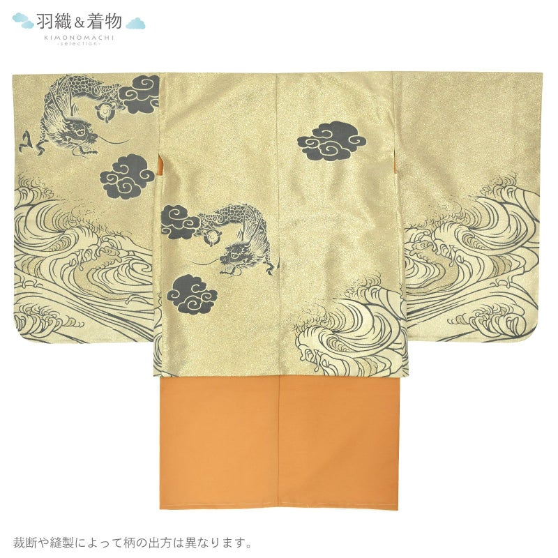 羽織はゴールドの菱の地模様、裾に濃いグレーの荒波。胸に雲と巴紋。袖や背に濃いグレーの雲に龍。衿は黒と金茶の雷紋にブラックシルバーの雲。着物は細かな千鳥格子の金茶色。長襦袢は紗綾形の地模様のある白。袴はチャコールグレー。帯、懐剣はやや緑みのグレー。メタルパーツの羽織紐。末広、白の鼻緒の草履のセットです。