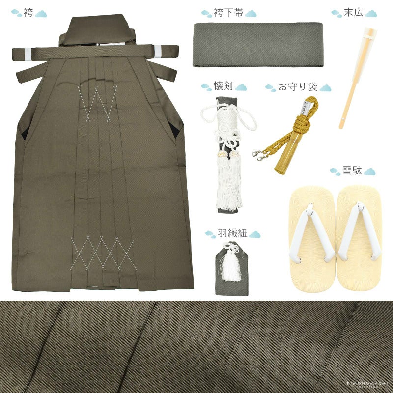 【商品内容】長襦袢・着物・羽織・袴・袴下帯・懐剣・お守り・羽織紐・雪駄・末広(扇子)・半衿(縫い付け済)・腰ひも2本(プレゼント)・足袋(プレゼント)の計13点