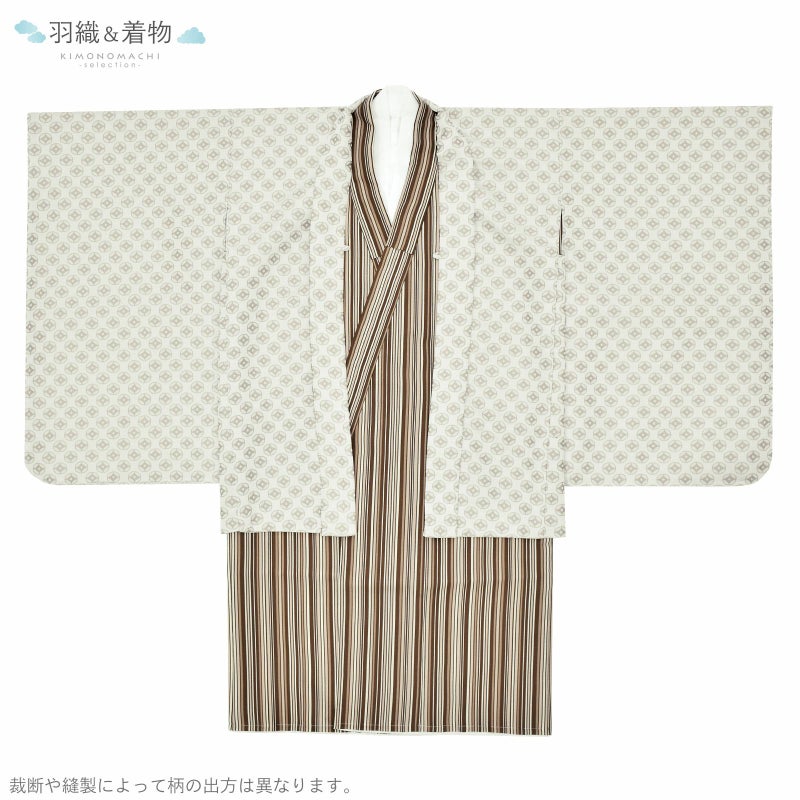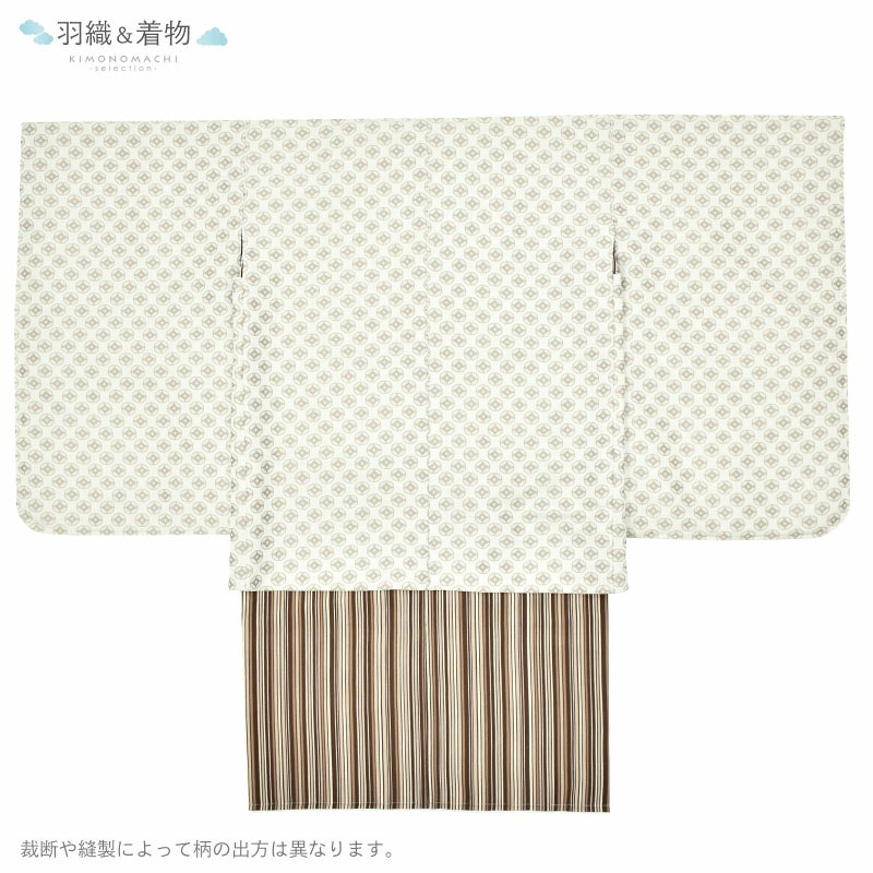 羽織はグレイッシュな白の地にベージュの七宝文様。着物は茶色に白茶、モカベージュの縞。白の襦袢がついています。袴は黒、グレー、薄茶のダイヤ柄。帯、懐剣はやや緑みのグレー。メタルパーツの羽織紐。末広。グレーの鼻緒に黒の台の草履。