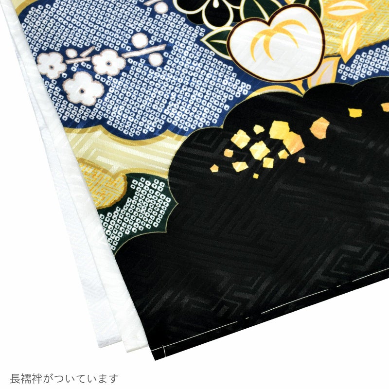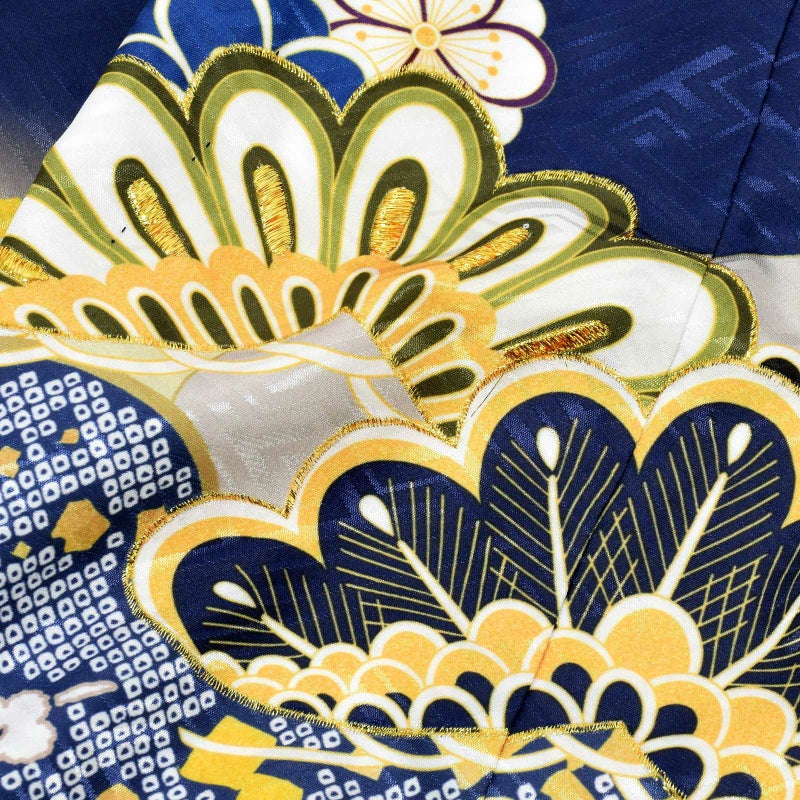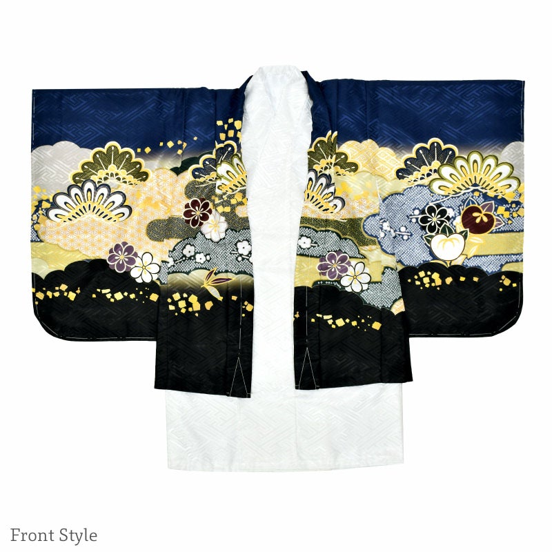 羽織は大きな紗綾形の地模様のある紺色の地、裾は黒色。雲取りに薄黄緑色、グレー、紺や山吹色の疋田や七宝花菱文様。白に浅い黄色、紺、黄緑色、紫紺などの松や菊、梅、橘、笹紋。ポイントにゴールドの刺繍。着物は紗綾形の地模様の白。長襦袢は細かな紗綾形の地模様の白。