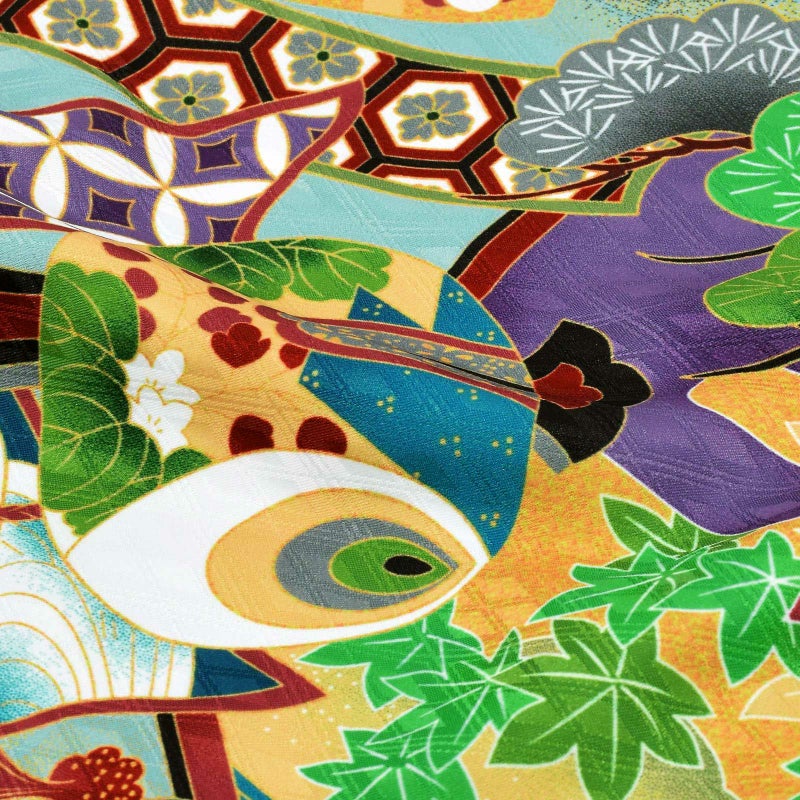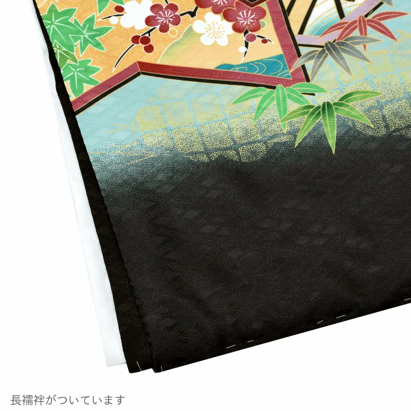 羽織は四つ割菱の地模様のある黒地に、淡いくすんだ水色の腰替わり。黒に青灰色、白の翼を広げた鷹。黄土色や深緑色、紺、海老茶色、くすんだ紫色などの配色の蔓帯や屏風。鼓や宝尽くし紋、松や楓。ポイントに金の刺繍。豪壮かつ煌びやかな中に、典雅な雰囲気を湛えています。着物は黒の四つ割菱の地模様。白の襦袢がついています。