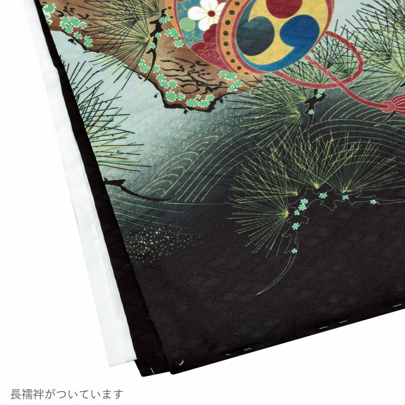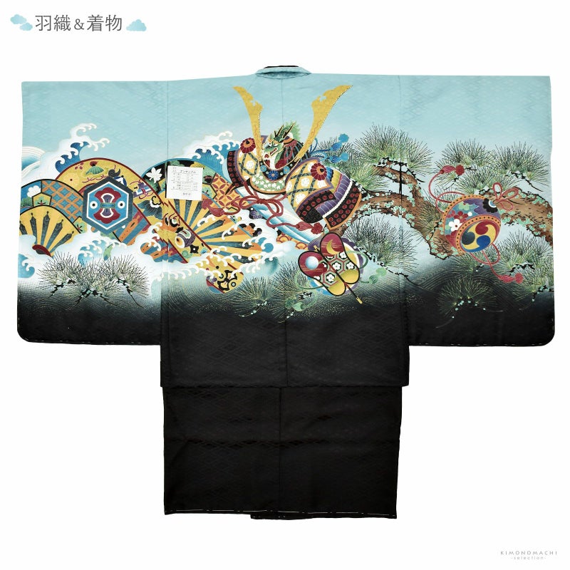 羽織は四つ割菱の地模様に、淡い灰みの水色、黒の裾ぼかし。波に浸かった黄土色や深緑色、紺、海老茶色、くすんだ紫色などの配色の片輪車文。その上にはポイントに金の刺繍がほどこされた龍頭の兜。軍配や笠、宝尽くし紋など。現代的な洒落た色み、勇壮な意匠に煌びやかさが添えられています。着物は黒の四つ割菱の地模様。白の襦袢がついています。