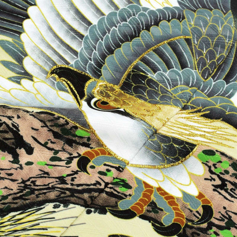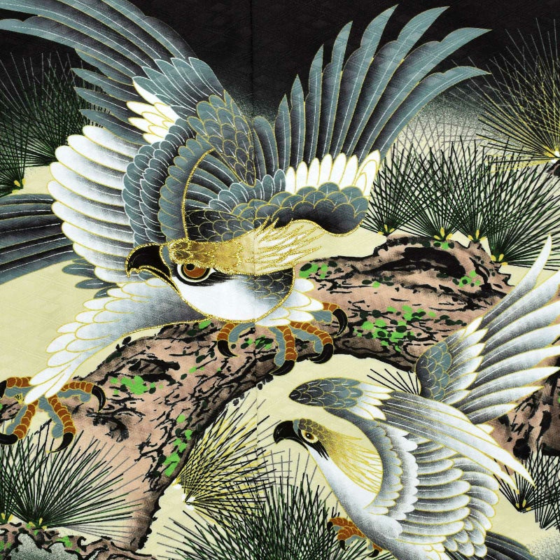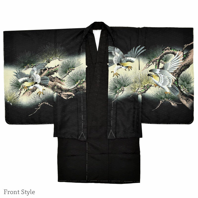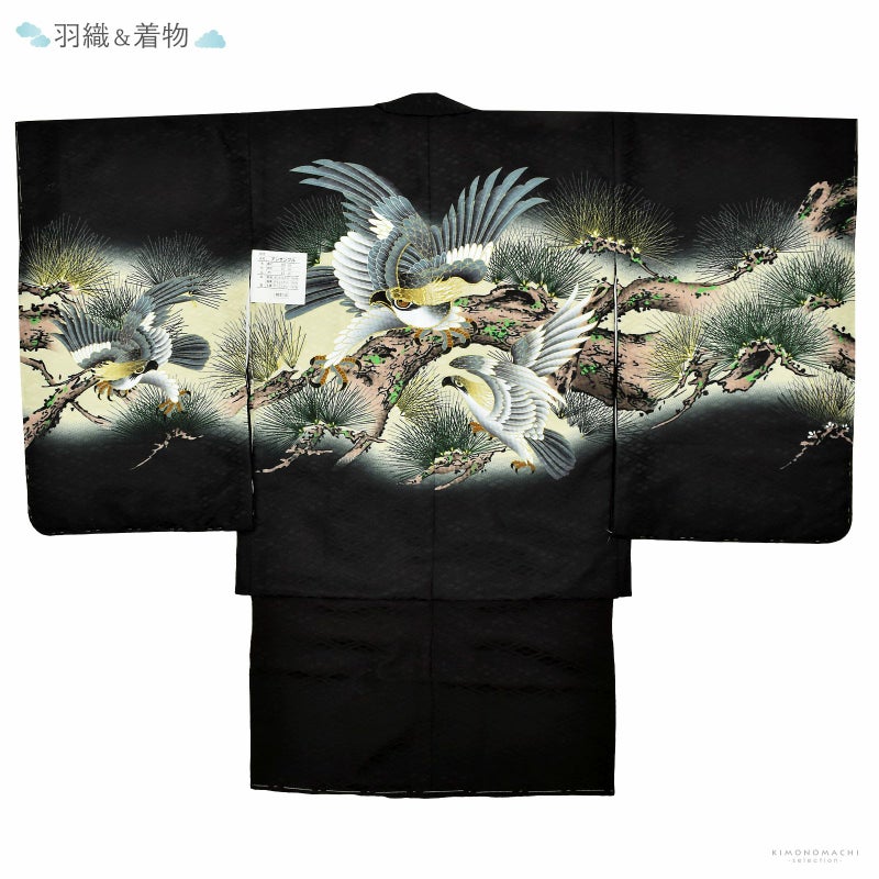 羽織は四つ割菱の地模様のある黒の地に、淡いくすんだ黄緑の腰替わり。背には幅いっぱいに茶や深緑の老松が表現され、その上に青灰色や黄茶色、白の翼を広げた鷹。ポイントに金の刺繍。黒が厳かさを感じさせ、風格のある勇壮な煌びやかさが添えられています。着物は黒の四つ割菱の地模様。白の襦袢がついています。