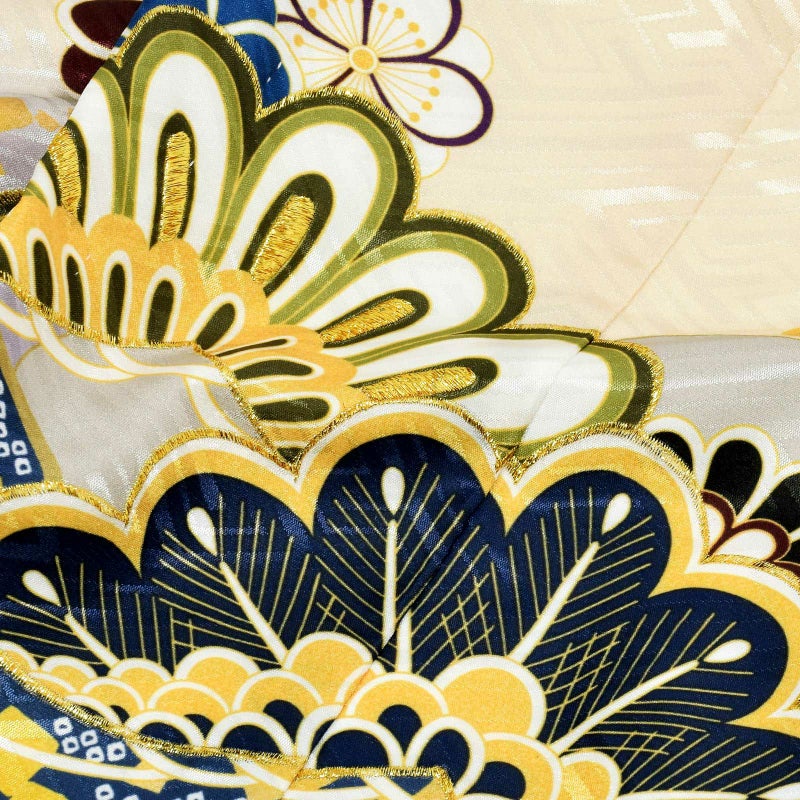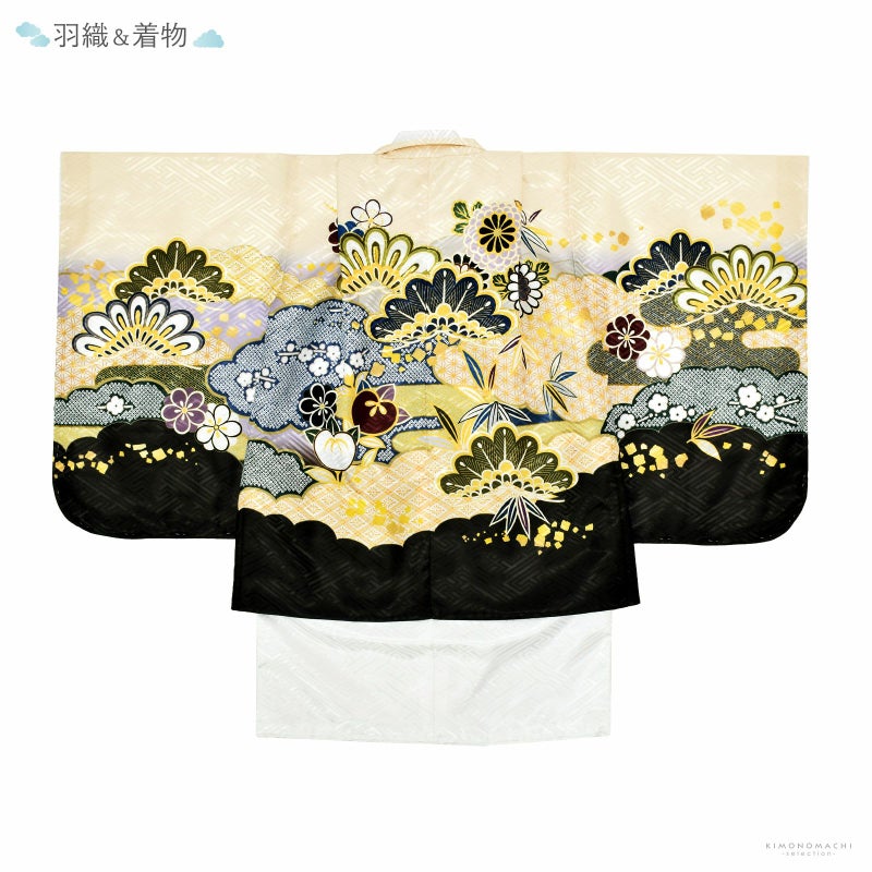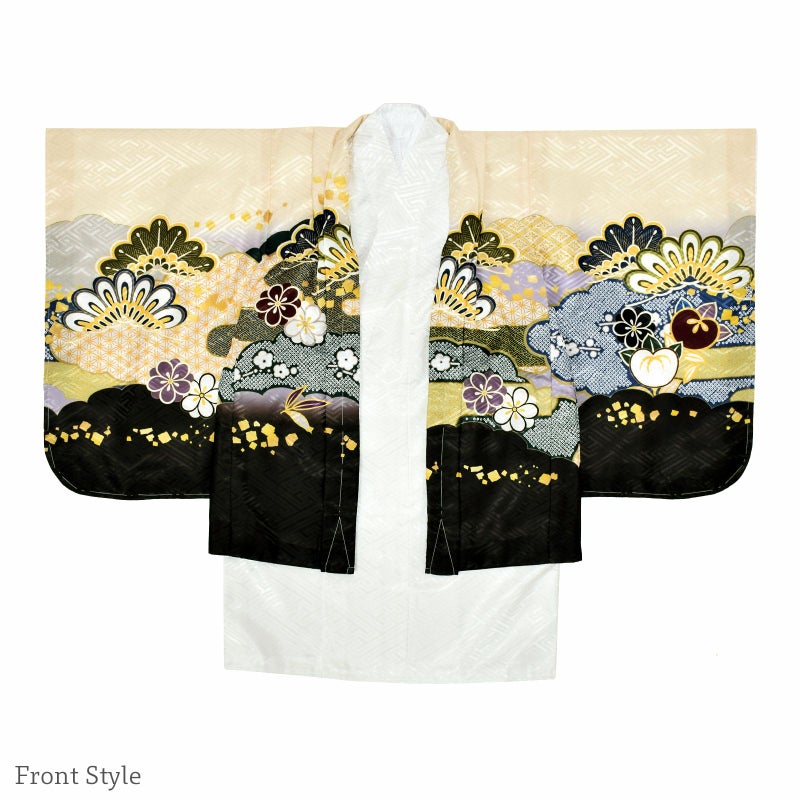 羽織は大きな紗綾形の地模様のある明るいベージュ地、裾は黒。雲取りに藤色、グレー、紺や山吹色の疋田や七宝花菱文様。白に淡い黄色、紺、抹茶色、紫紺などの松や菊、梅、橘、笹紋。ポイントにゴールドの刺繍。着物は紗綾形の地模様の白。長襦袢は細かな紗綾形の地模様の白。