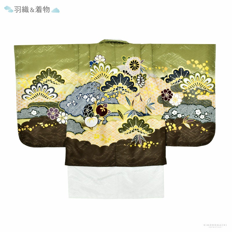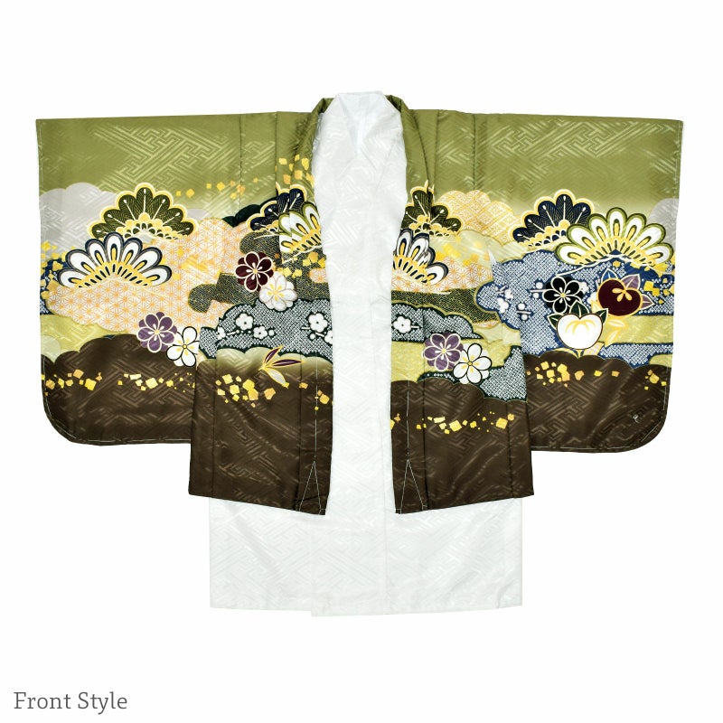 羽織は大きな紗綾形の地模様のある抹茶色の地、裾は深い抹茶色。雲取りに薄黄緑色、グレー、紺や山吹色の疋田や七宝花菱文様。白に浅い黄色、紺、黄緑色、紫紺などの松や菊、梅、橘、笹紋。ポイントにゴールドの刺繍。着物は紗綾形の地模様の白。長襦袢は細かな紗綾形の地模様の白。