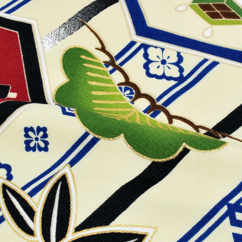 クリーム地×ブルーの縞と亀甲に、筒守や丁子・松を描いたお着物に、黒袴を合わせた、カジュアルな袴セットです。