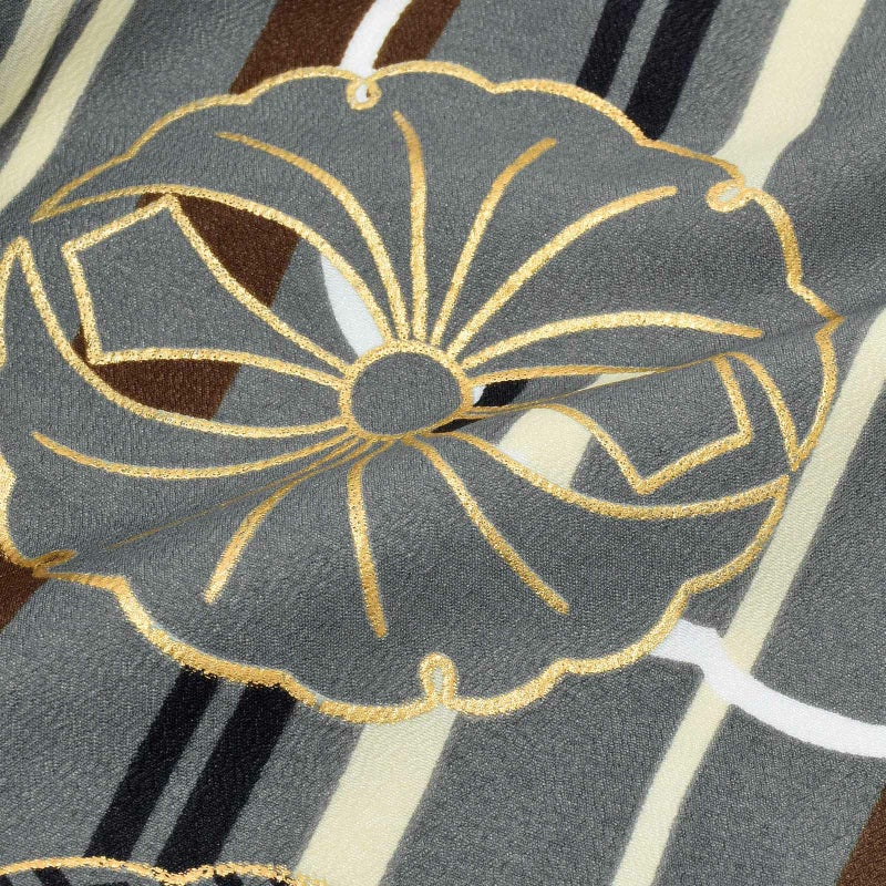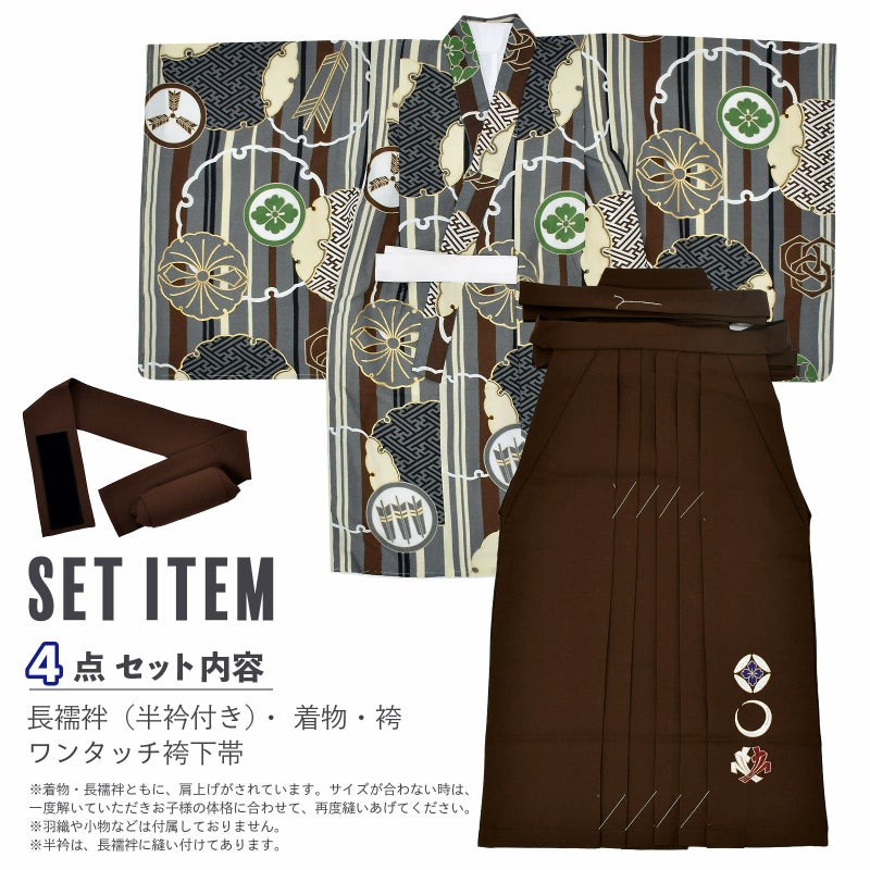縞模様のグレー地に雪輪を描いたお着物に、茶色の袴を合わせた、カジュアルな袴セットです。
