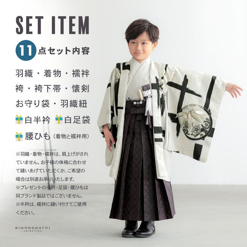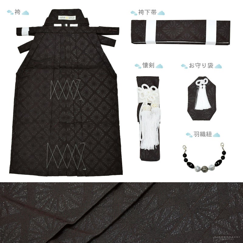 【商品内容】長襦袢・着物・羽織・袴・袴下帯・懐剣・お守り・羽織紐・足袋(プレゼント)・腰ひも2本(プレゼント)・半衿(プレゼント)の計11点
