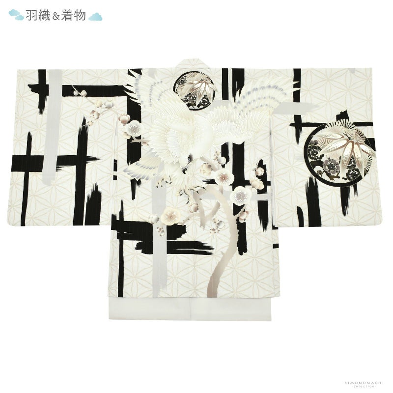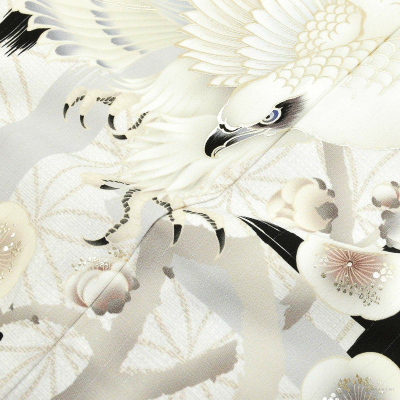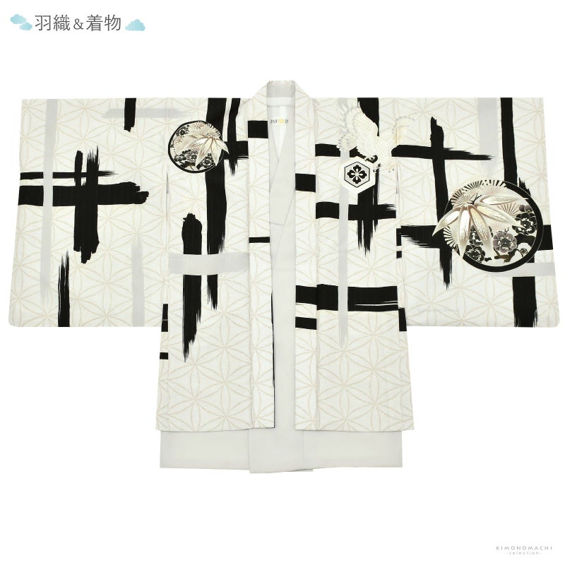 羽織は白にごく淡いグレーの霜降り模様の地にベージュの変わり輪繋ぎ。シルバーのピンストライプ。黒、グレーの大きな破れ格子。その上に、アイボリーにベージュ、グレーの梅に白鷹。マットな金彩。着物は淡い灰緑色、襦袢は白。袴はこげ茶色地に黒の菱文。共布の帯。白にメタルパーツやビーズの羽織紐。