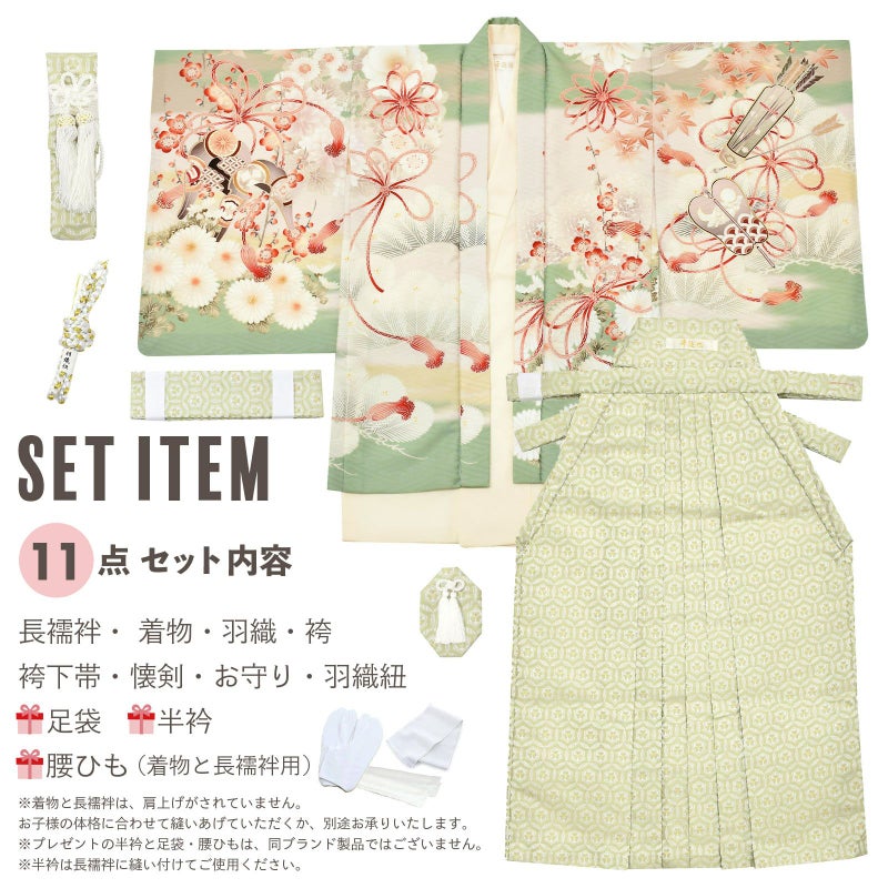 【商品内容】長襦袢・着物・羽織・袴・袴下帯・懐剣・お守り・羽織紐・足袋(プレゼント)・腰ひも2本(プレゼント)・半衿(プレゼント)の計11点
