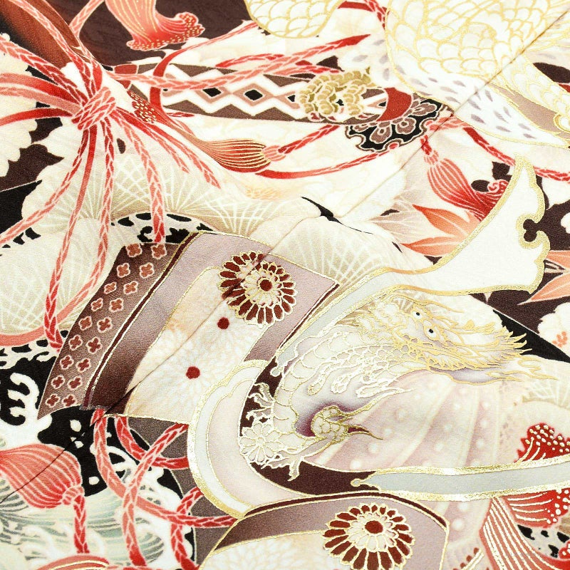 羽織は紗綾形の地模様に海老茶色、黒、鳶色のぼかしの地。ベージュや淡い朱色、赤で楓や桜、百合、菊などの四季の花々、黒や白の兜や刀剣などの武具。その上に、アイボリーにベージュの羽根を広げた白鷹。マットな金彩が奥行と煌びやかさを添えます。着物は深い赤紫、襦袢は白。袴は深いこげ茶色地に墨色の亀甲、ゴールドの三つ葉。共布の帯。白にゴールドの組み紐の羽織紐。