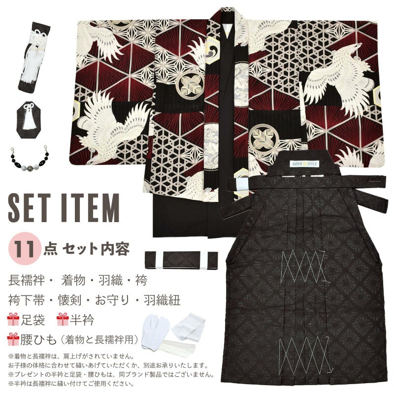 【商品内容】長襦袢・着物・羽織・袴・袴下帯・懐剣・お守り・羽織紐・足袋(プレゼント)・腰ひも2本(プレゼント)・半衿(プレゼント)の計11点