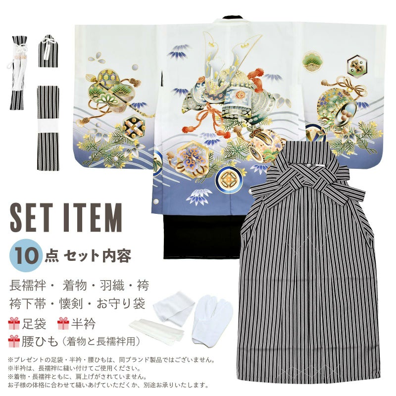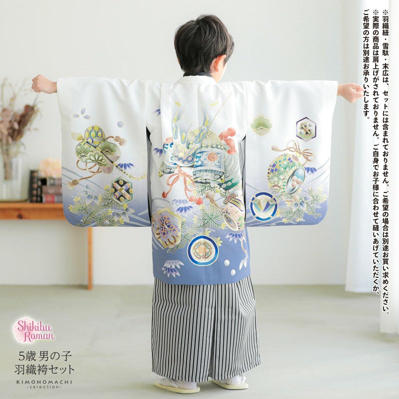 七五三 着物 男の子 5歳 羽織袴セット「白 兜に波、笹」フルセット 5歳向け 5才 五歳 男児用 着物セット 子供着物 五才のお祝い着