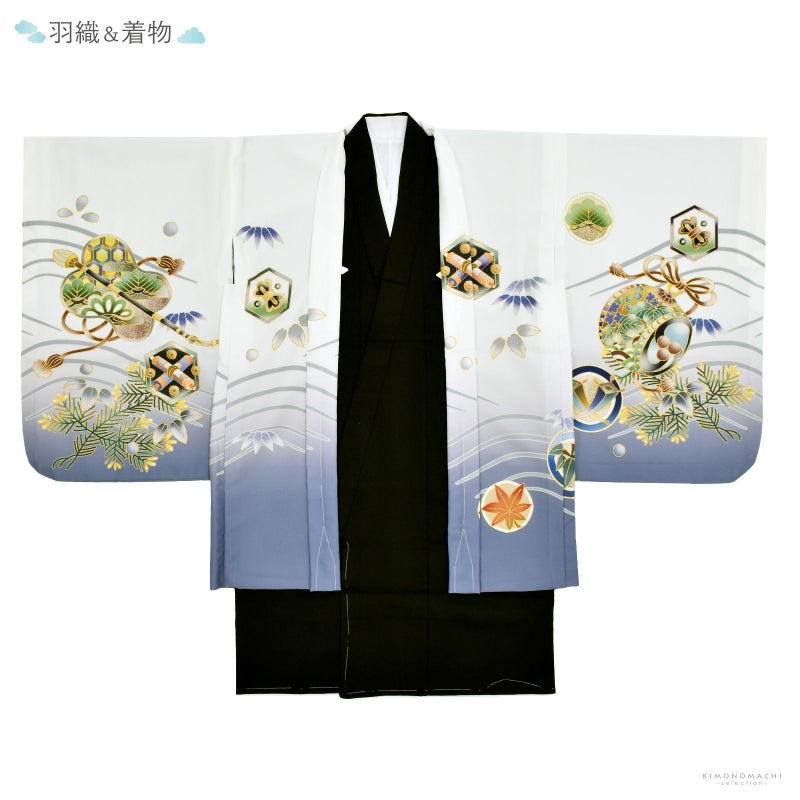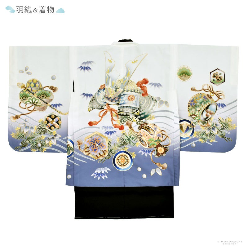 【色柄】羽織は白地にやや青紫みのグレーの裾ぼかし。グレーの波に深緑色の若松、青紫色の笹紋。背には白やグレー、青灰色、緑の兜に赤茶の組紐。ポイントに金銀の刺繍が威風と煌びやかさを添えます。袖などに小槌や軍配、宝尽くし紋。着物は黒。白の襦袢がついています。
