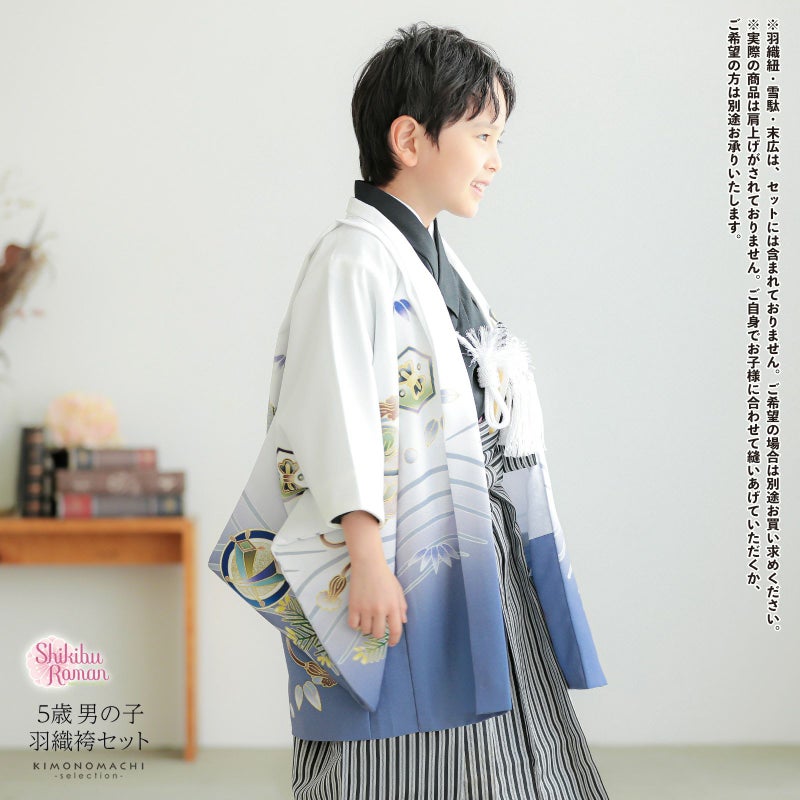 七五三の男の子に、5歳?7歳の卒園式に 袴セット 七五三 着物 男の子 5歳 羽織袴セット「白 兜に波、笹」フルセット 5歳向け 5才 五歳 男児用 着物セット 子供着物 五才のお祝い着【メール便不可】