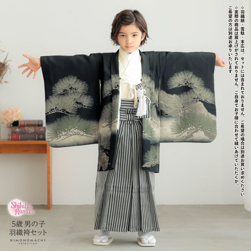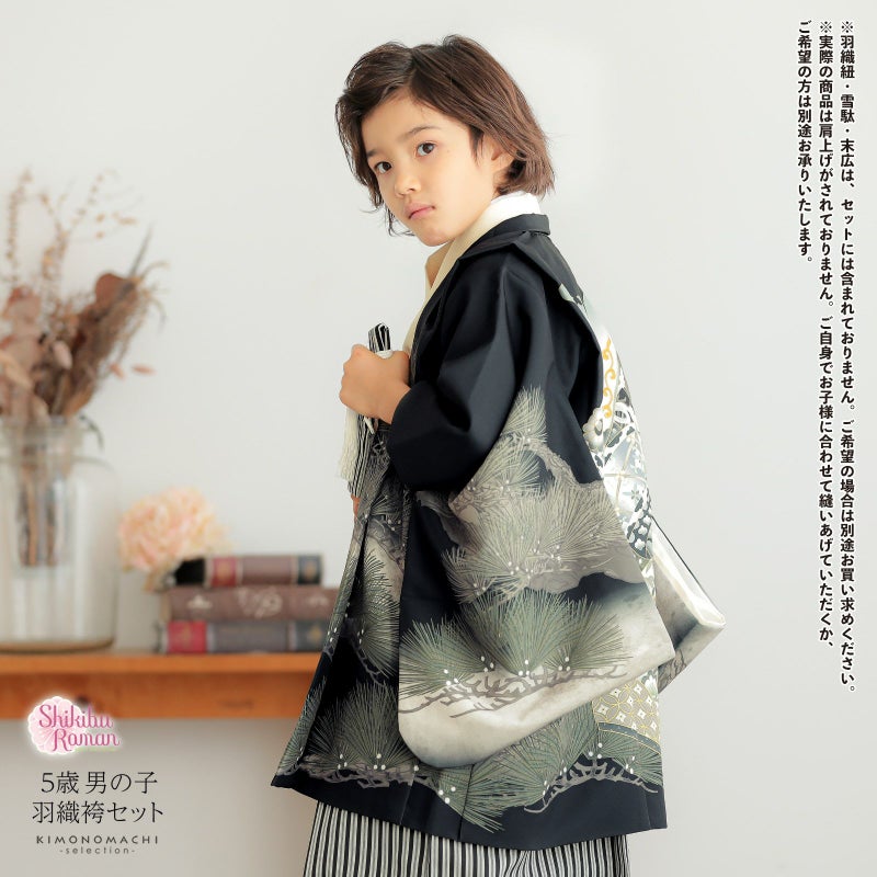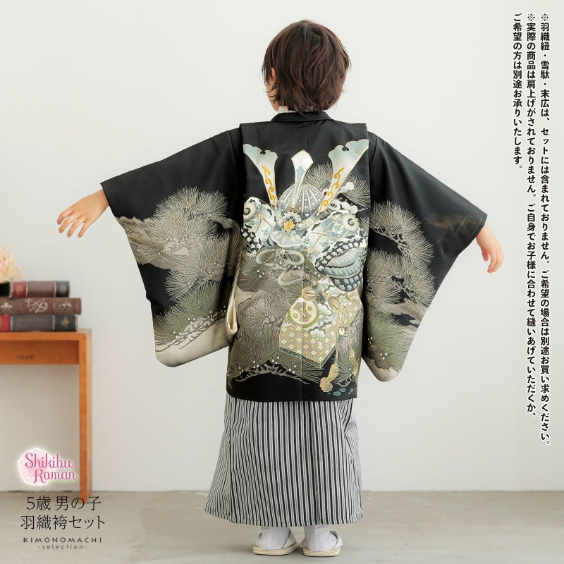 七五三の男の子に、5歳?7歳の卒園式に 袴セット 七五三 着物 男の子 5歳 羽織袴セット「黒色 兜に松」フルセット 5歳向け 5才 五歳 男児用 着物セット 子供着物 五才のお祝い着【メール便不可】