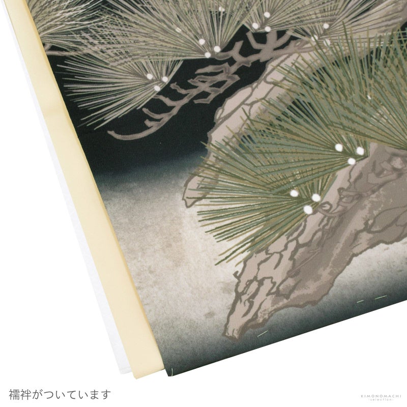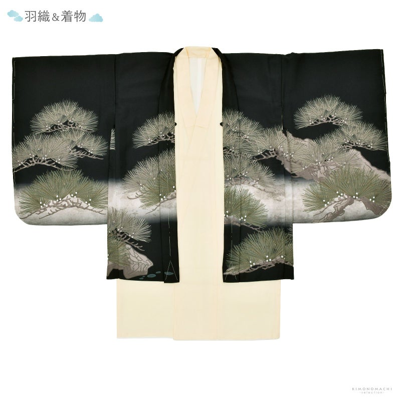 【色柄】羽織は黒の地にベージュグレーの腰替わり。背には幅いっぱいにグレイッシュな白茶や浅緑の老松が表現され、その上に白やグレー、青灰色の兜。黄緑やベージュ系の文箱。ポイントにゴールドやブルーグレーの刺繍が勇壮な煌びやかさを添えます。着物はアイボリー。白の襦袢がついています。