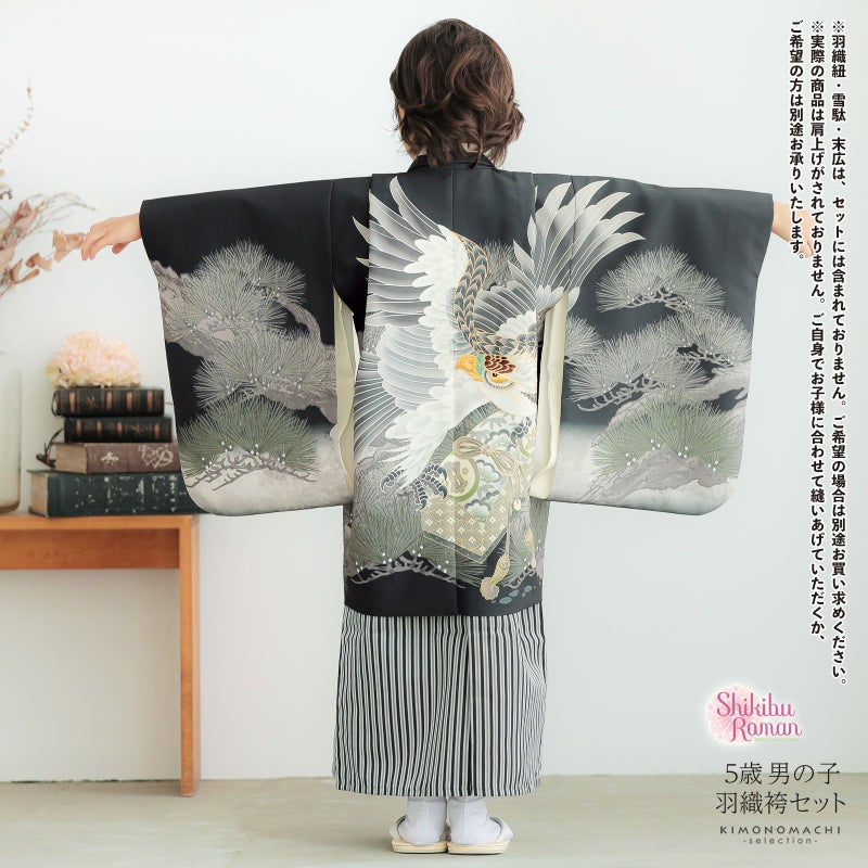 七五三の男の子に、5歳?7歳の卒園式に 袴セット 七五三 着物 男の子 5歳 羽織袴セット「黒 鷹に松」フルセット 5歳向け 5才 五歳 男児用 着物セット 子供着物 五才のお祝い着【メール便不可】
