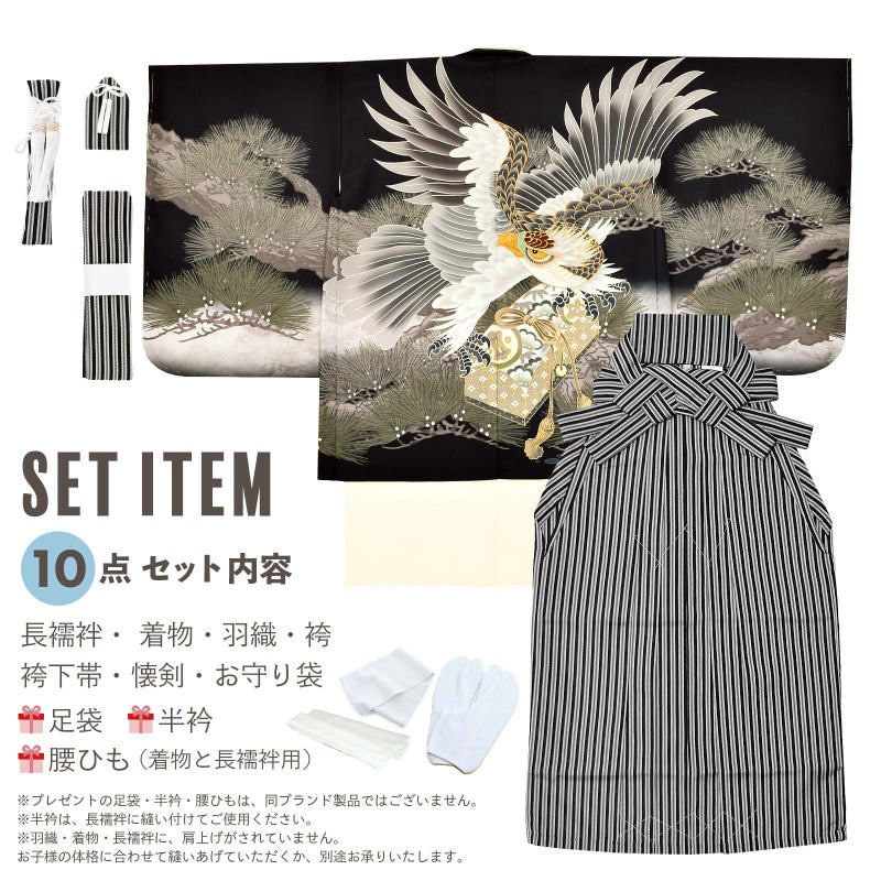 七五三 着物 男の子 5歳 羽織袴セット「黒 鷹に松」フルセット 5歳向け 5才 五歳 男児用 着物セット 子供着物 五才のお祝い着