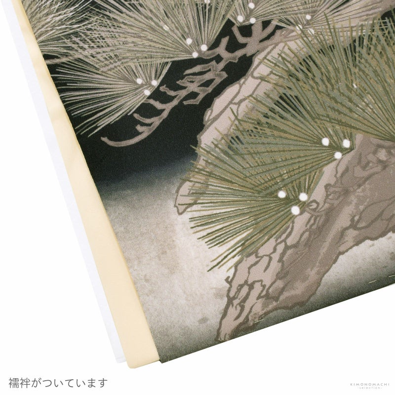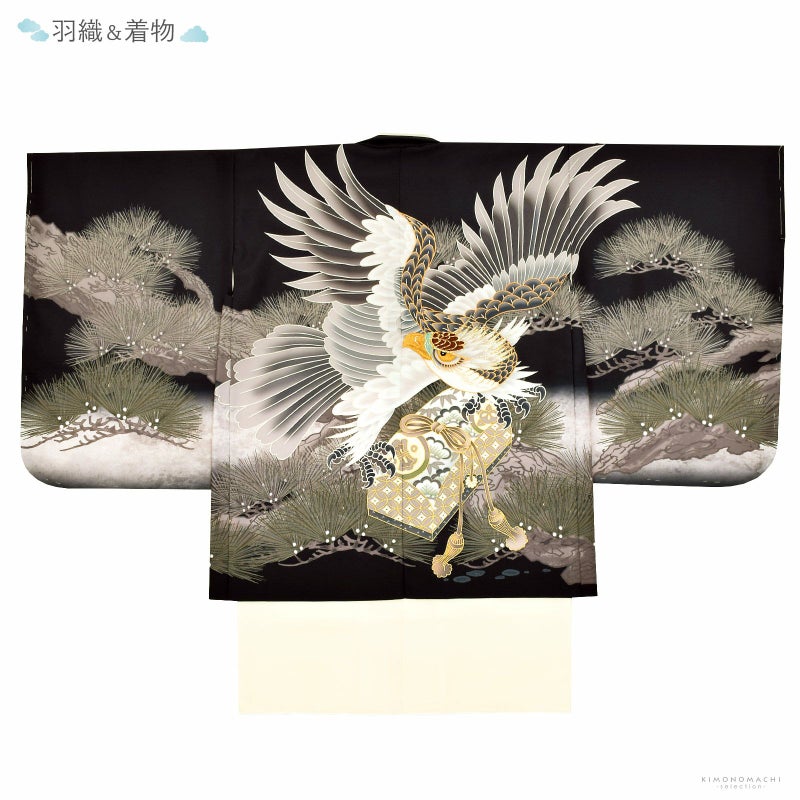 【色柄】羽織は黒地に灰みの白茶の腰替わり。背には幅いっぱいに白茶や浅緑の老松が表現され、その上にベージュやチャコール、白、挿し色に山吹色の翼を広げた鷹。文箱。ポイントに金やターコイズの刺繍が豪壮な煌びやかさを添えます。着物はアイボリー。白の襦袢がついています。