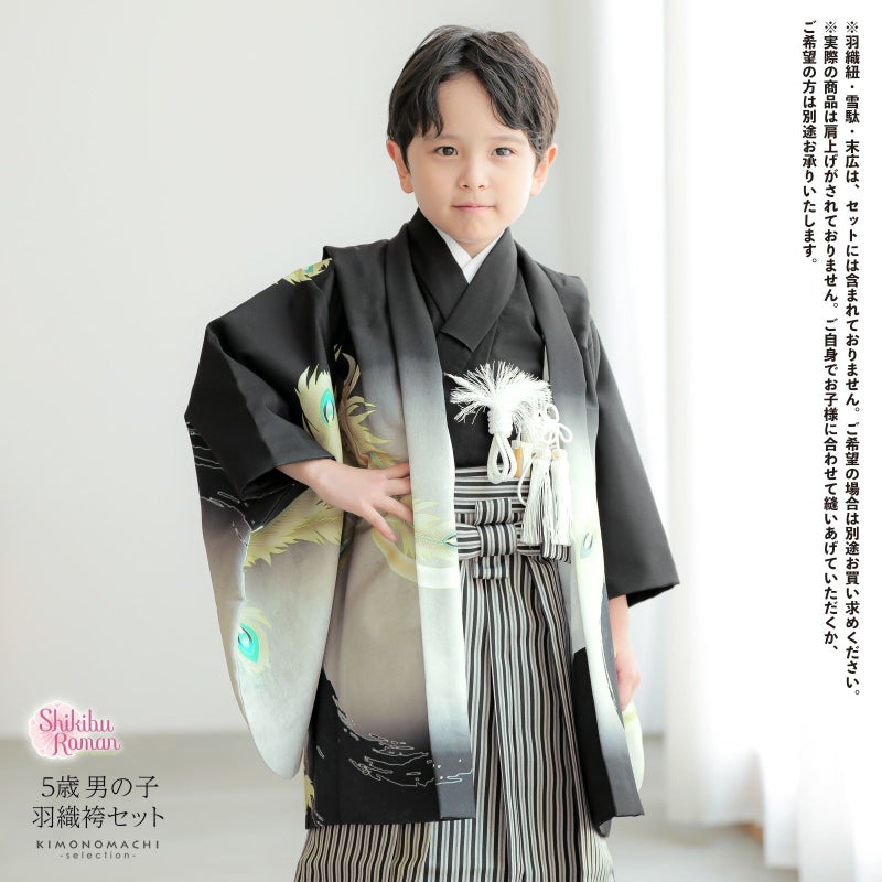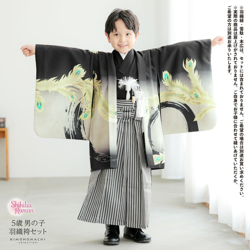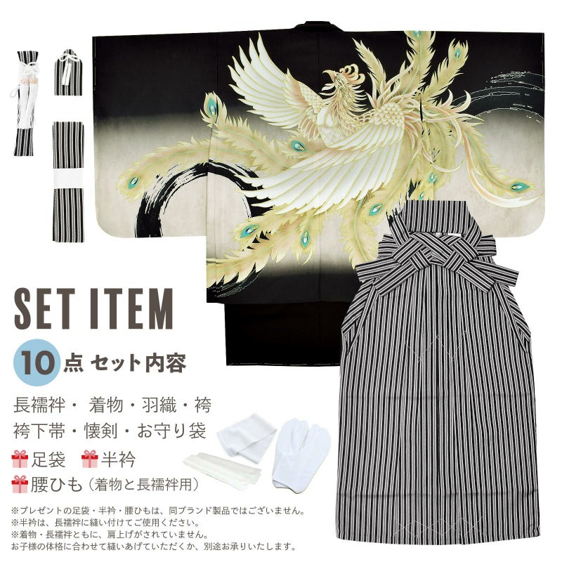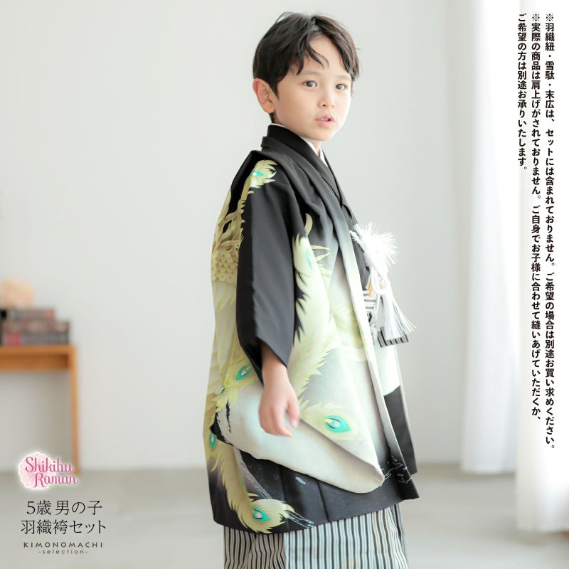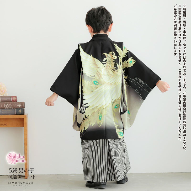 七五三の男の子に、5歳?7歳の卒園式に 袴セット 七五三 着物 男の子 5歳 羽織袴セット「黒 鳳凰」フルセット 5歳向け 5才 五歳 男児用 着物セット 子供着物 五才のお祝い着【メール便不可】