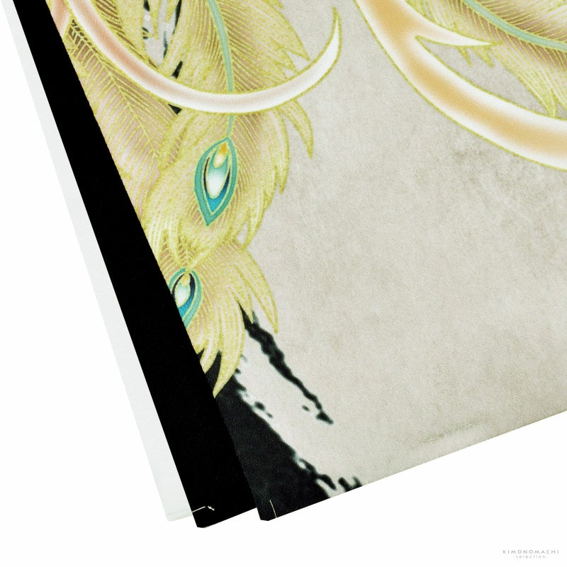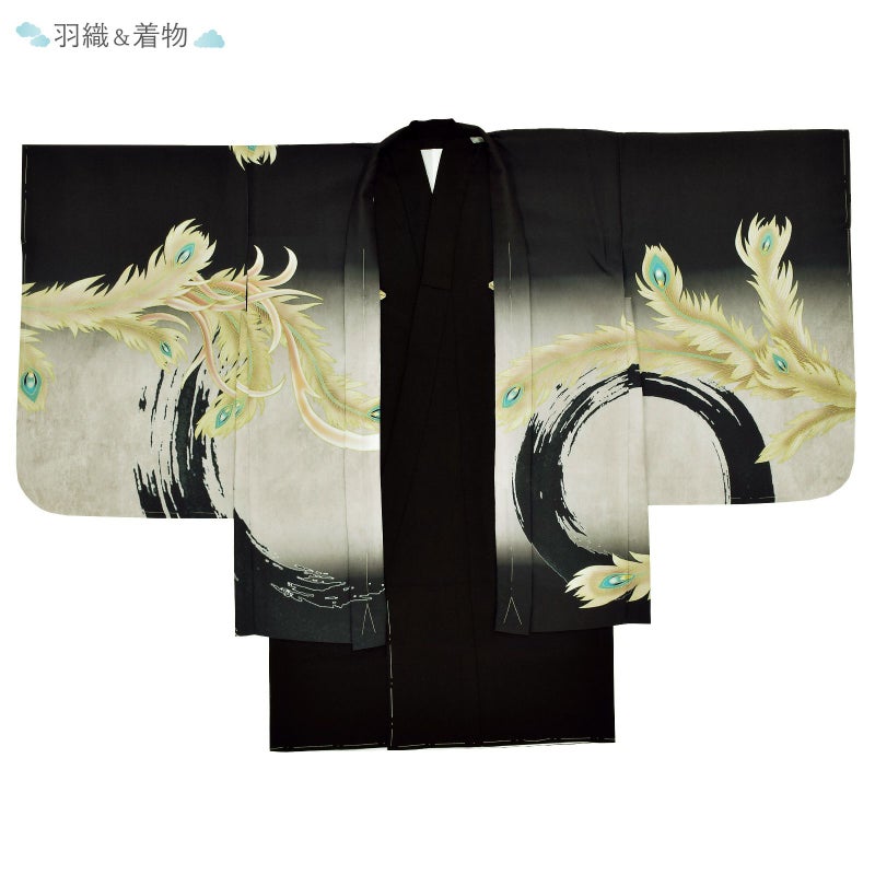 【色柄】羽織は黒地にベージュの腰替わり。黒の立浪のような大きな丸。背には白に灰緑色、ベージュの羽根、青磁色や青緑色の挿し色の入った尾羽を広げた優美な鳳凰。ポイントに金糸やラメ糸の刺繍が気品と煌びやかさを添えます。着物は黒。白の襦袢がついています。