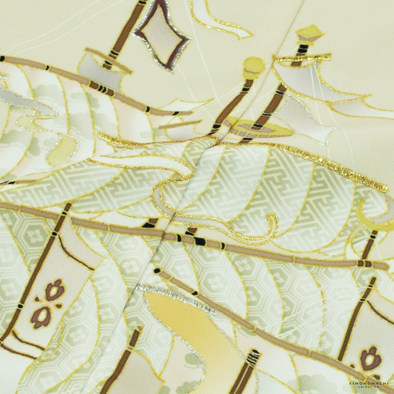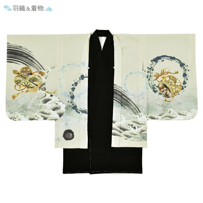 【色柄】羽織はややグレイッシュなベージュ地。藍墨色の立浪のような大きな丸。背には白に薄緑や淡いグレーの吉祥文様の帆、茶色やからし色の船体のハイカラな帆船。ポイントに金銀の刺繍が煌びやかさを添えます。袖などに茶色やからし色の太鼓や軍配、小槌。着物は黒。白の襦袢がついています。
