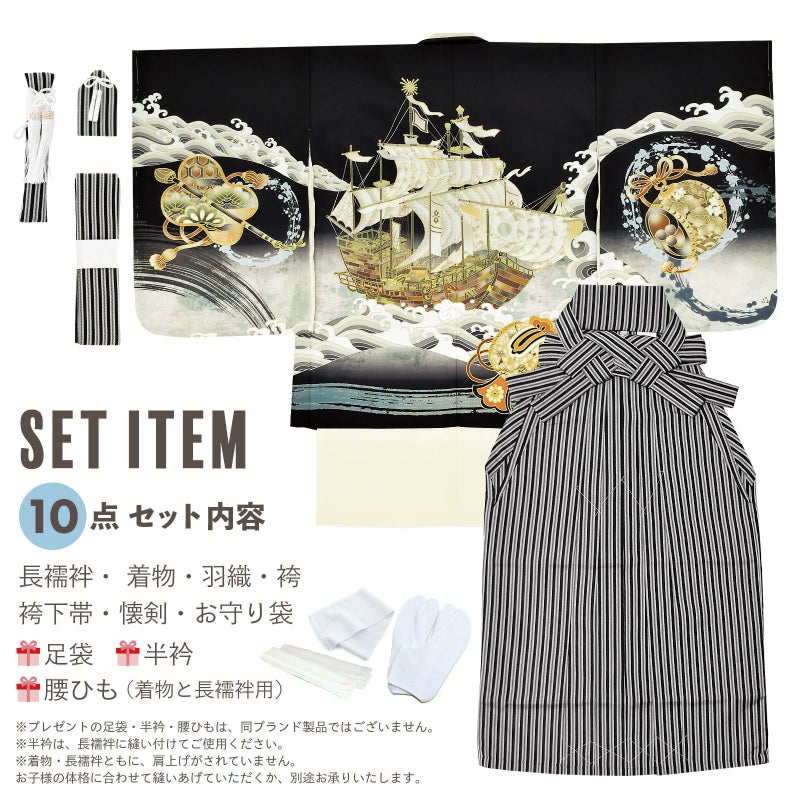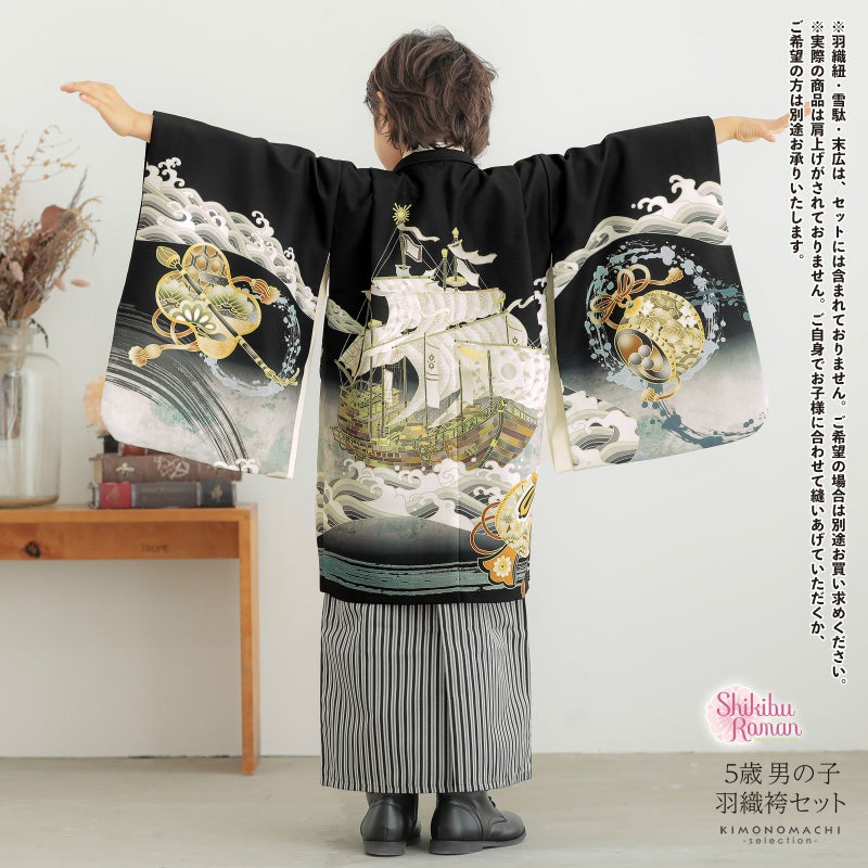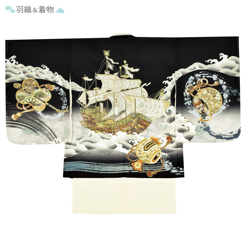 七五三 着物 男の子 5歳 羽織袴セット「黒 波に帆船」フルセット 5歳向け 5才 五歳 男児用 着物セット 子供着物 五才のお祝い着【メール便不可】