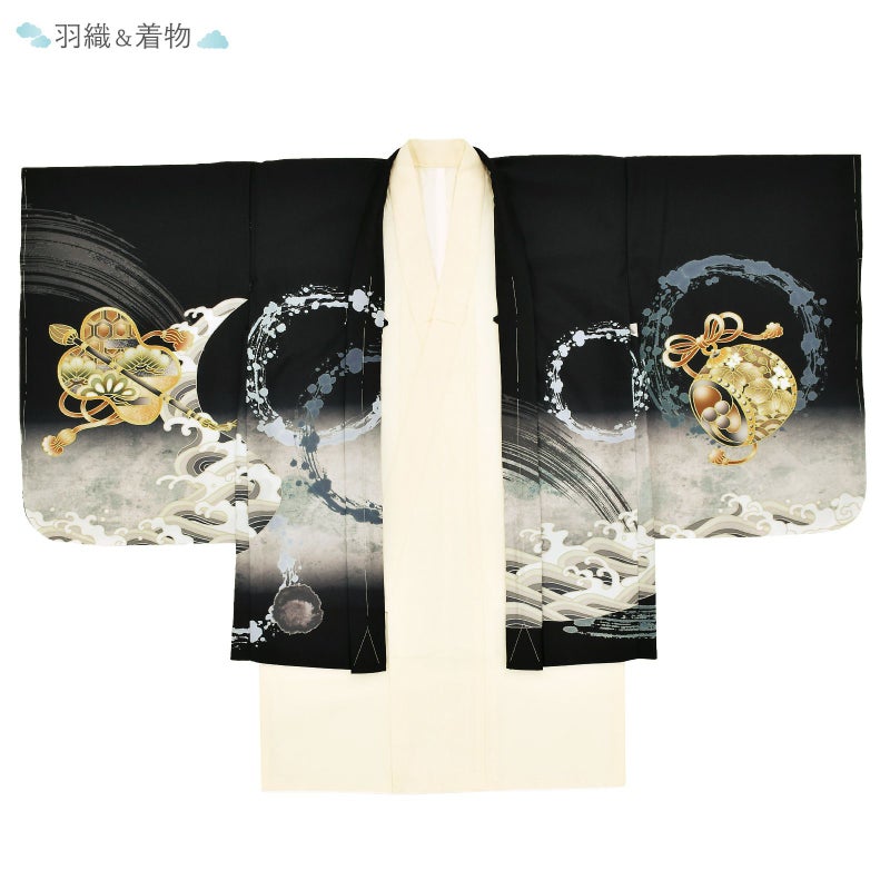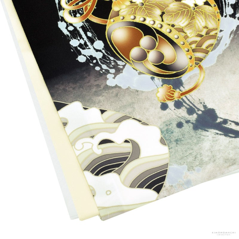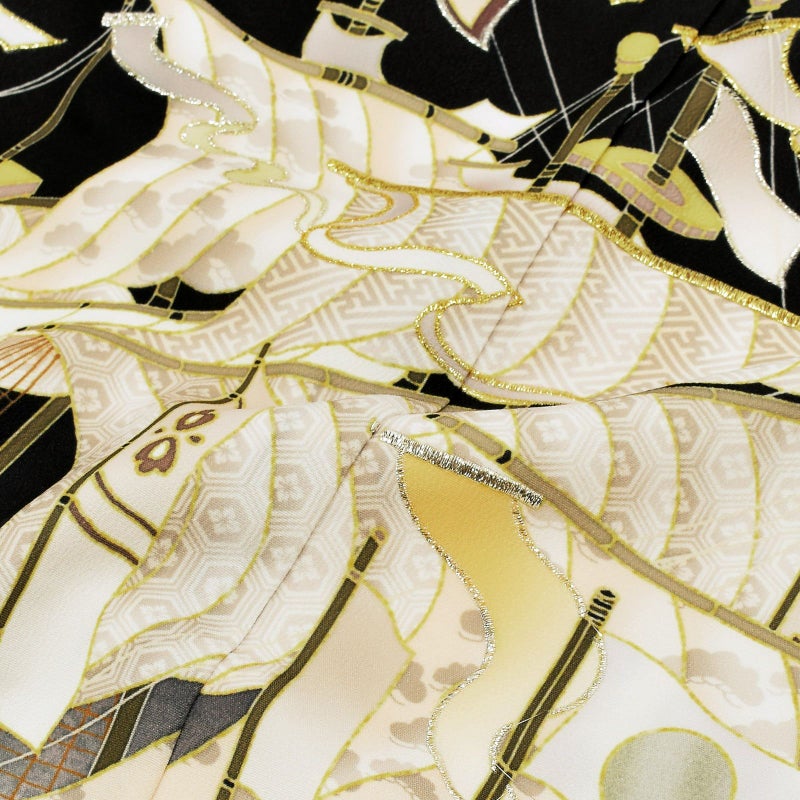 【色柄】羽織は黒地にグレーの腰替わり。藍墨色の立浪のような大きな丸。背には白にベージュ、グレーの吉祥文様の帆、茶色や抹茶色の船体のハイカラな帆船。ポイントに金銀の刺繍が洗練された輝きを添えます。袖などに茶色や深緑色の太鼓や軍配、小槌。着物はアイボリー。白の襦袢がついています。