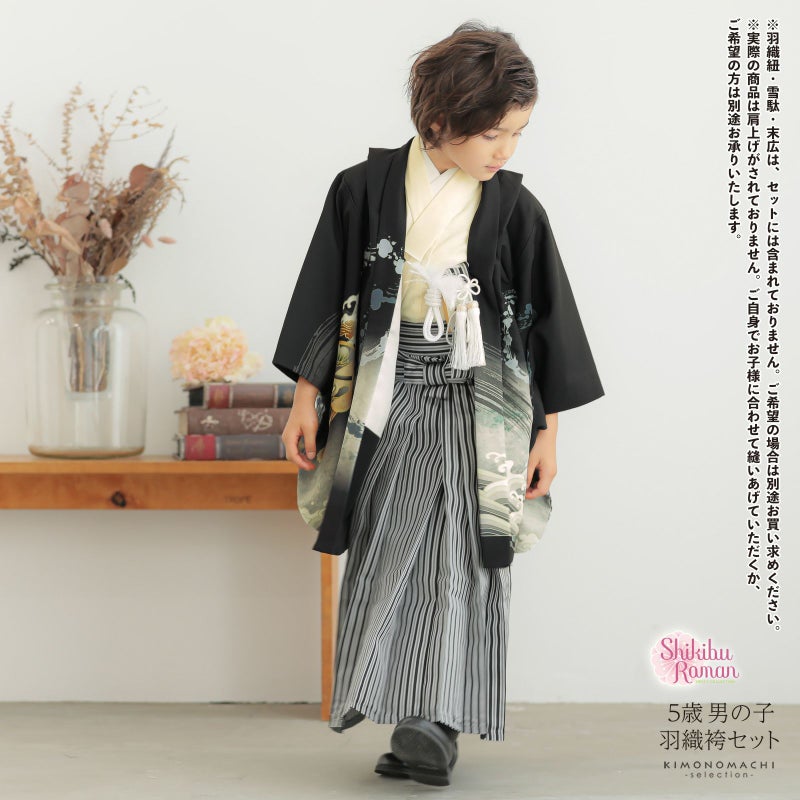 七五三の男の子に、5歳?7歳の卒園式に 袴セット 七五三 着物 男の子 5歳 羽織袴セット「黒 波に帆船」フルセット 5歳向け 5才 五歳 男児用 着物セット 子供着物 五才のお祝い着【メール便不可】