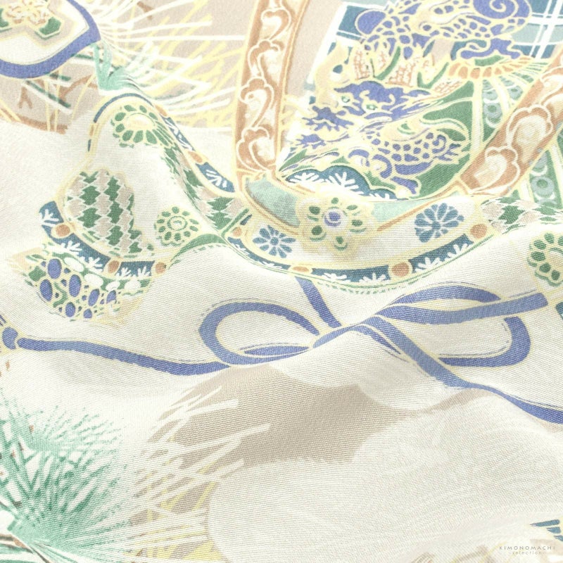 【色柄】羽織は淡いベージュに波と舟、紺鼠色やブルーグレーの格子が市松状に配置されています。その上に、淡いグリーンやグレイッシュな青紫、紺鼠色、ベージュで表現された兜や鎧縅に刀、鐙などの武具、宝船、亀甲、松葉など。着物は深い緑みの青。襦袢は白。袴は光沢のあるジャンパンベージュの地にゴールドのラメの縦縞。帯はベージュ。懐剣、お守り袋もベージュ。淡いグレイッシュな水色の羽織紐。