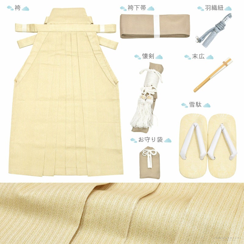 【商品内容】長襦袢・着物・羽織・袴・袴下帯・懐剣・お守り袋・羽織紐・末広(扇子)・雪駄・半衿・腰ひも2本(プレゼント)・足袋(プレゼント)の計13点