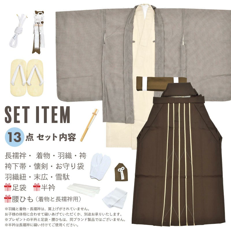 【商品内容】長襦袢・着物・羽織・袴・袴下帯・懐剣・お守り袋・羽織紐・末広(扇子)・雪駄・半衿・腰ひも2本(プレゼント)・足袋(プレゼント)の計13点