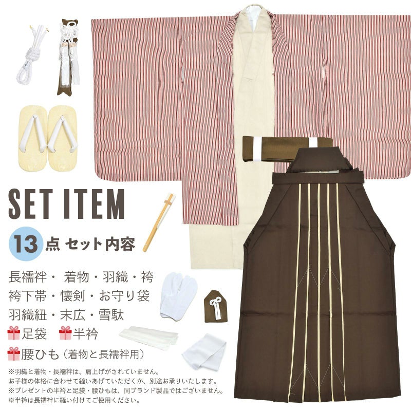 【商品内容】長襦袢・着物・羽織・袴・袴下帯・懐剣・お守り袋・羽織紐・末広(扇子)・雪駄・半衿・腰ひも2本(プレゼント)・足袋(プレゼント)の計13点