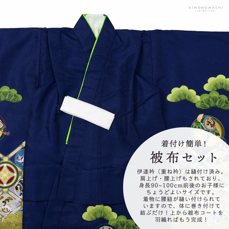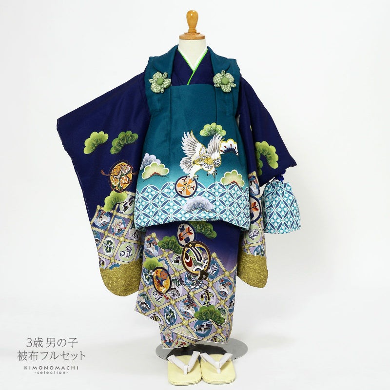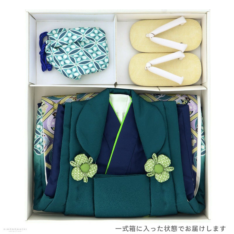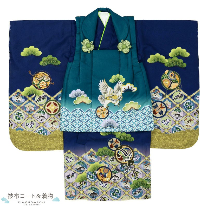 七五三 着物 3歳 男の子 被布セット「孔雀緑 鉄紺色、格天井に宝尽くし」三歳男児被布セット 子供着物 フルセット 三才のお祝い着 3才向け【メール便不可】
