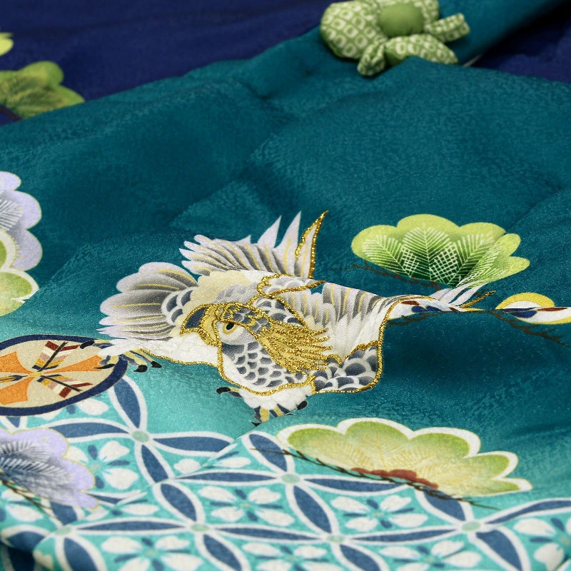 被布コートはあざやかな青緑色地。淡いグレー系の鷹に緑の松。ポイントにゴールドの刺繍。裾模様にターコイズブルーに灰青の七宝文様。被布飾りは抹茶色の鹿の子のつまみのお花。