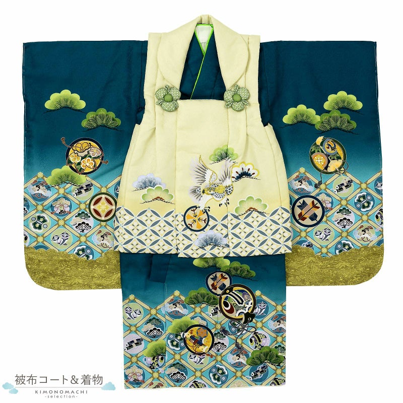 被布コートはあざやかな青緑色地。淡いグレー系の鷹に緑の松。ポイントにゴールドの刺繍。裾模様にベージュに灰青の七宝文様。被布飾りは抹茶色の鹿の子のつまみのお花。