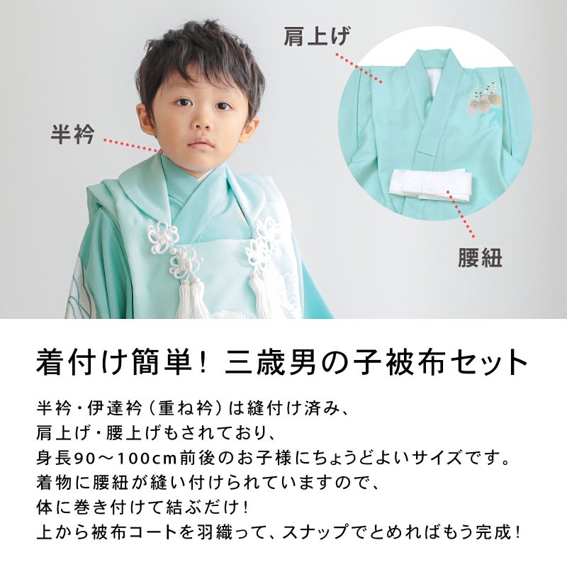 3歳のお祝いをするお子様の平均身長に合わせて、身長90~100cmぐらいのお子様がぴったりと着ていただけるサイズになっています。