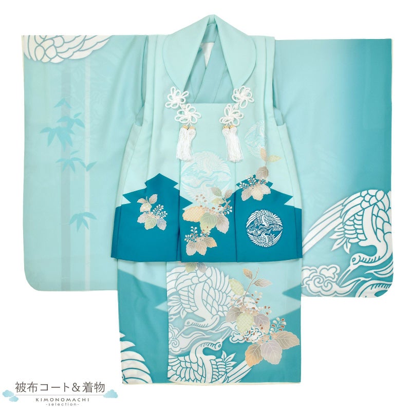 【色柄】被布コートはややグレイッシュな明るい水色地に深いターコイズの松皮取り。白抜きで向かい鶴紋、淡い緑や青、薄橙色、ベージュなどの桐文様。白い組紐の被布飾り。着物はややグレイッシュな水色に淡いターコイズの松皮取り。大きな向かい鶴紋に桐、竹文様。白の長襦袢。白い鼻緒の雪駄。巾着は黒地の疋田文様。