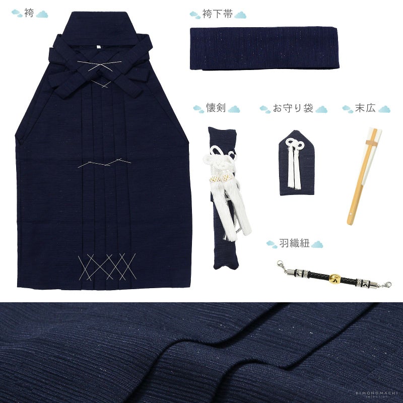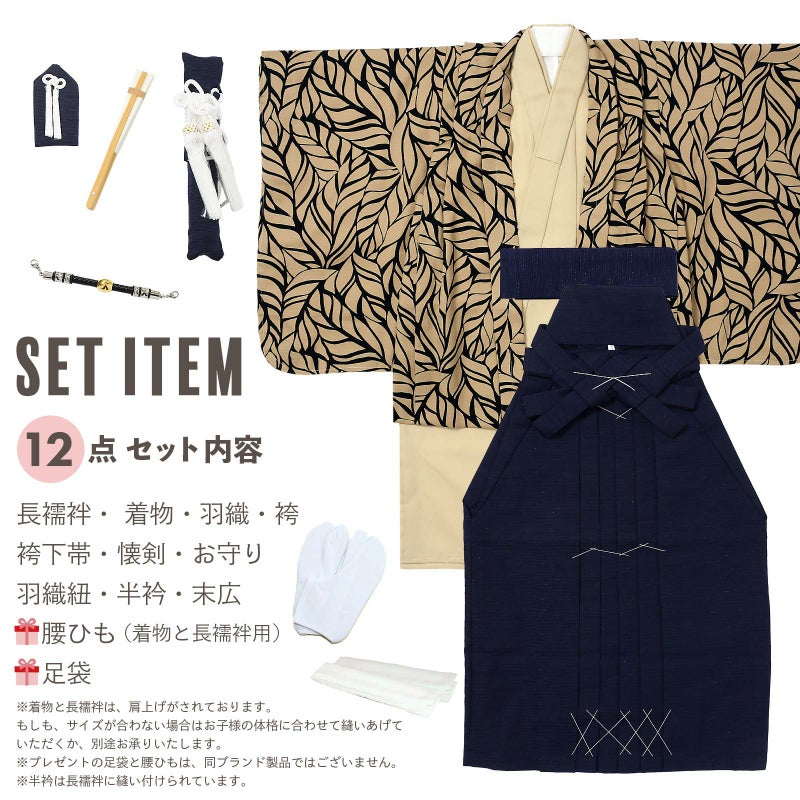 【商品内容】長襦袢・着物・羽織・袴・袴下帯・懐剣・お守り・羽織紐・半衿・末広(扇子)・腰ひも2本(プレゼント)・足袋(プレゼント)の計12点